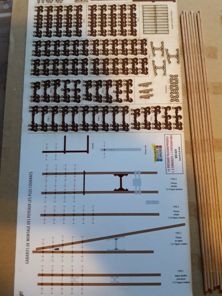 Pour l'époque choisie, aucune ligne était dépourvue de lignes télégraphiques ne serait-ce que pour que les gares communiquent entre elles. Pour ma part, j'ai fait le choix d'une ligne fictive de type transversale à trafic moyen. J'ai donc pris le parti de n'équiper mes poteaux que de trois traverses de 8 isolateurs, ce qui correspond à 24 lignes. Le kit prévoit 6 traverses par poteaux. J'ai donc maintenant construit 2 poteaux simples sur 8 et j'ai essayé le poteau avec un appuis consolidé avec des fers. Le kit prévoit le décalage des consoles pour tenir compte de la jambe de force qui aurait masquer le passage des câbles par endroit.