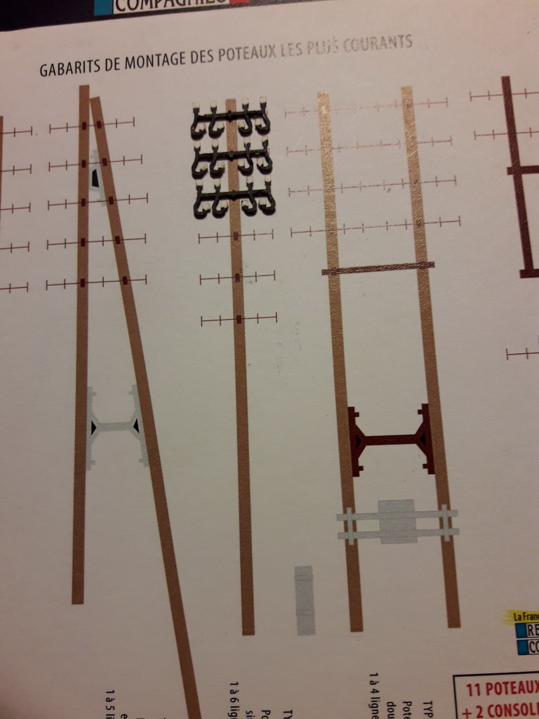 J'ai utilisé la méthode de fixation provisoire par de l'adhésif transparent pour l'assemblage sur le gabarit.Didier, je sais que tu es attaché au réalisme. Pour une ligne à voie unique, tu pourrais te contenter de 16 lignes voir moins, ce qui fait encore beaucoup pour les tirer. La longueur maximale entre poteaux est de 50m soit 57 cm ce qui est beaucoup. La norme EDF est de 36 m soit 46cm . D'après les photos, l'espace entre poteaux correspond plutôt à une ou 2 voitures de voyageur .