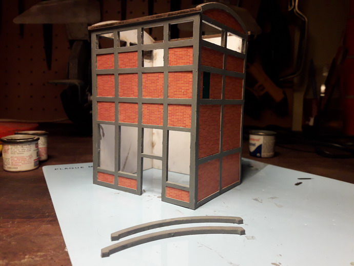 Pose des huisseries et puis des vitrages. Ces derniers sont à découper dans une plaque livrée dans le kit. J'ai attaqué le toit. Je l'ai cambré au préalable sur un tuyau de 60mm. Il manque un bon mm et la cambrure ne tient pas.