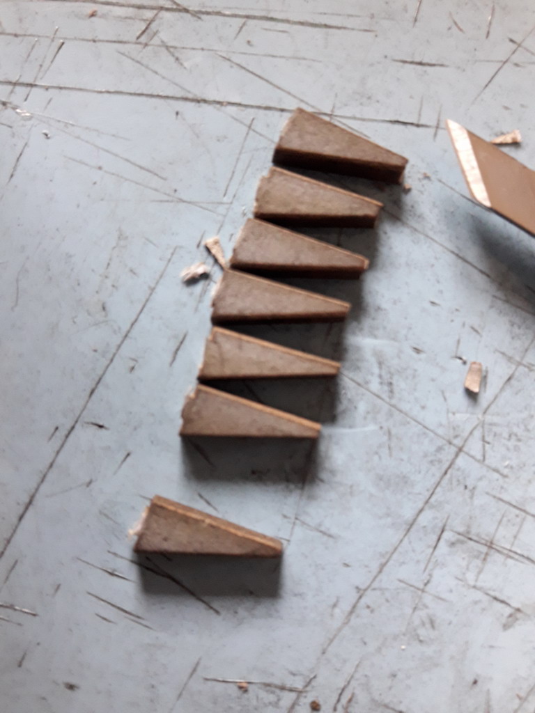 Suite...J'ai fixé définitivement les croisillons en baguette de bois pour maintenir les façades (une longueur de 65mm et une longueur de 85mm) . Je pense que la déformation est dû à la couche de vernis mat.