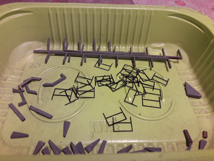 Il y a intérêt à peindre les pièces avant collage. les rembardes sont refaites avec un marqueur noir et les pièces entièrement peintes au gris Humbrol mat 140: