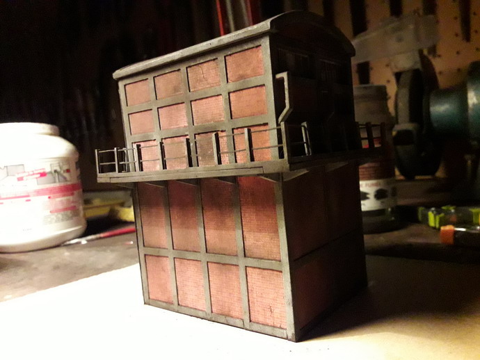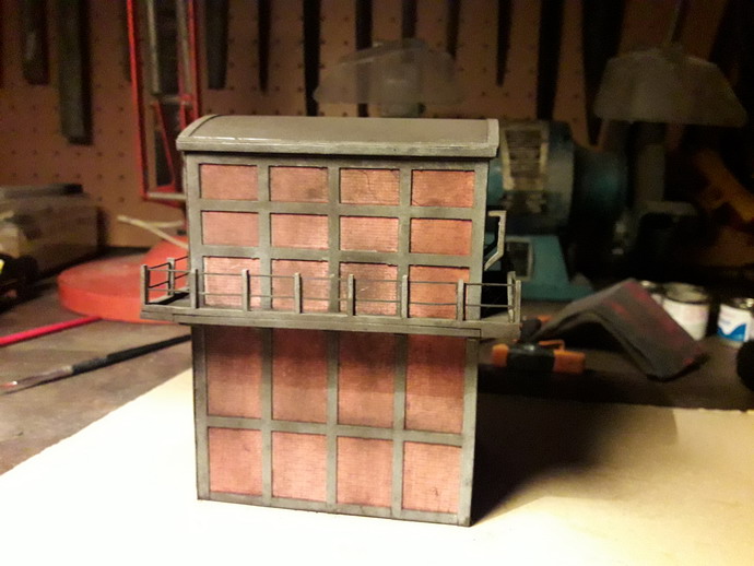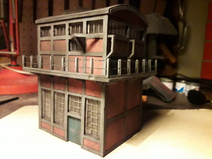 J'ai donc entretoisé l'intérieur pour que les faces redeviennent planes. Pas facile la mise en place les balcons. Il a fallu tricher car l'ajustage était délicat avec des dixièmes de mm trop courts ou trop longs. il a fallut peindre les structures de béton dans le même ton. Les rambardes étaient très délicates à poser car en carton mince. La colle à bois permet quand même l'ajustage.