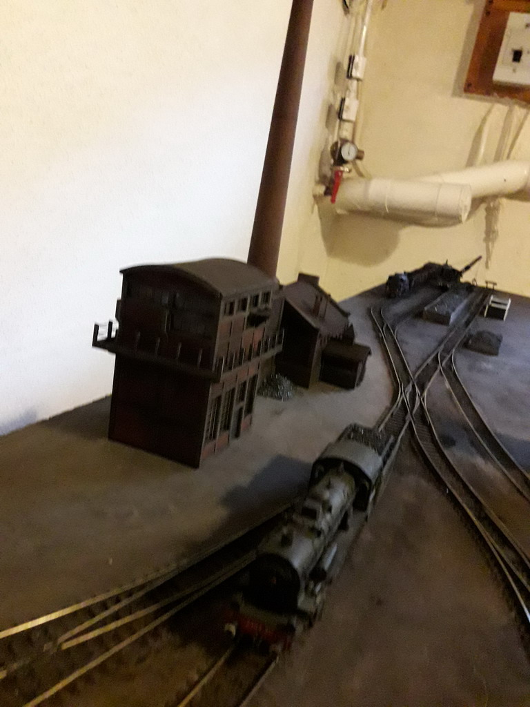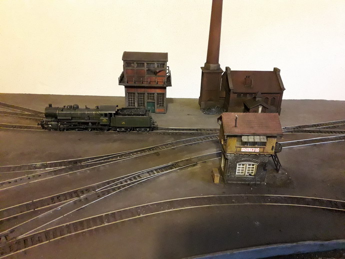 Et après quelques reprises, j'ai patiné copieusement le bâtiment pour qu'il s'insère au dépôt. Toujours de la poudre noir de fumée pour tinter le ciment appliquée au pinceau doux pour gouache en respectant l'application dans le sens vertical pour les murs. J'aurai aimer figuré les câbles électriques mais je suis dans la version câbles enterrés. R&C ne fournit pas les poteaux MT contrairement à la version de Montrouge. Et dans les dépôts, il y en avait un paquet de poteaux.