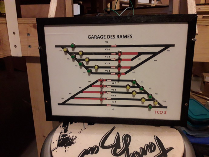 Le panneau est démonté de son support incliné. Par convention les déviations courbes sont en jaune et la voie directe en vert. Les aiguillages sont couplés deux à deux par voie de circulation.