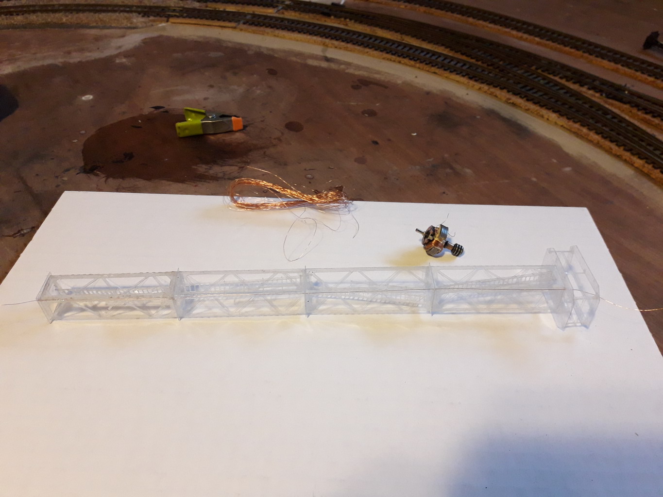 Retour sur le pylône d'éclairage. Je n'ai pas plus suivre l'exemple de Biscatrain qui a fait courir deux fils de cuivre à l'intérieur des cornières. Il était déjà monté. Ce sera pour le deuxième Pylône. J'ai pus débobiner un rotor Rivarossi d'un moteur HS. J'avais un Jouef que je n'avais pas pu faire. J'a donc percé à l'extérieur au droit des cornières qui seront orientées à l'abri des regards, à 0.35mm pour y passer le fil très mince. J'ai tendu le fil pour y mettre un pont de colle: