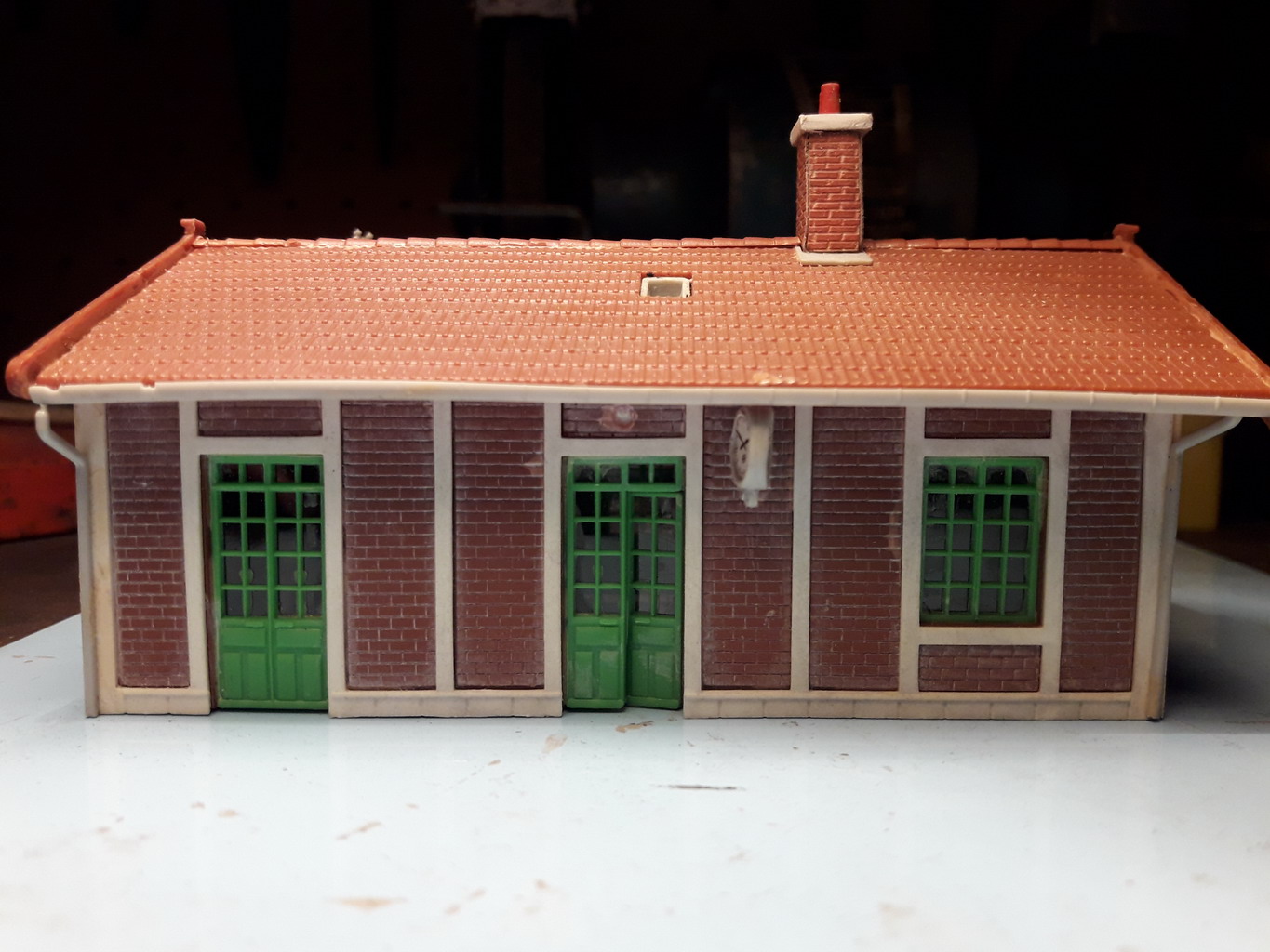 J'ai mis de coté le pylône. Des travaux extérieurs pour ma maison ralentissent l'avancement du réseau. Ma Dremmel a rendu l'âme. Il semblerait qu'un fil de bobinage du rotor soit cassé. En attendant j'ai acheté sur eBay le bureau de la feuille MKD d'occasion, monté et cheminée manquante. J'ai commencé par en fabriquer une et complété les tuiles faitières manquantes. (on agrandit en cliquant sur les photos).
