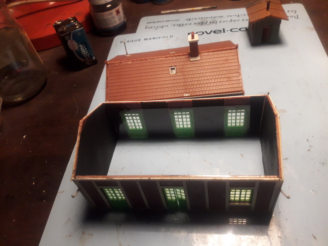 Reprise du bâtiment de la feuille. Il a fallu décoller la toiture mal positionnée. Impossible de démonter les portes barbouillées de colle.