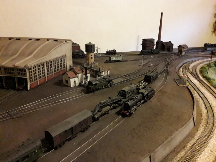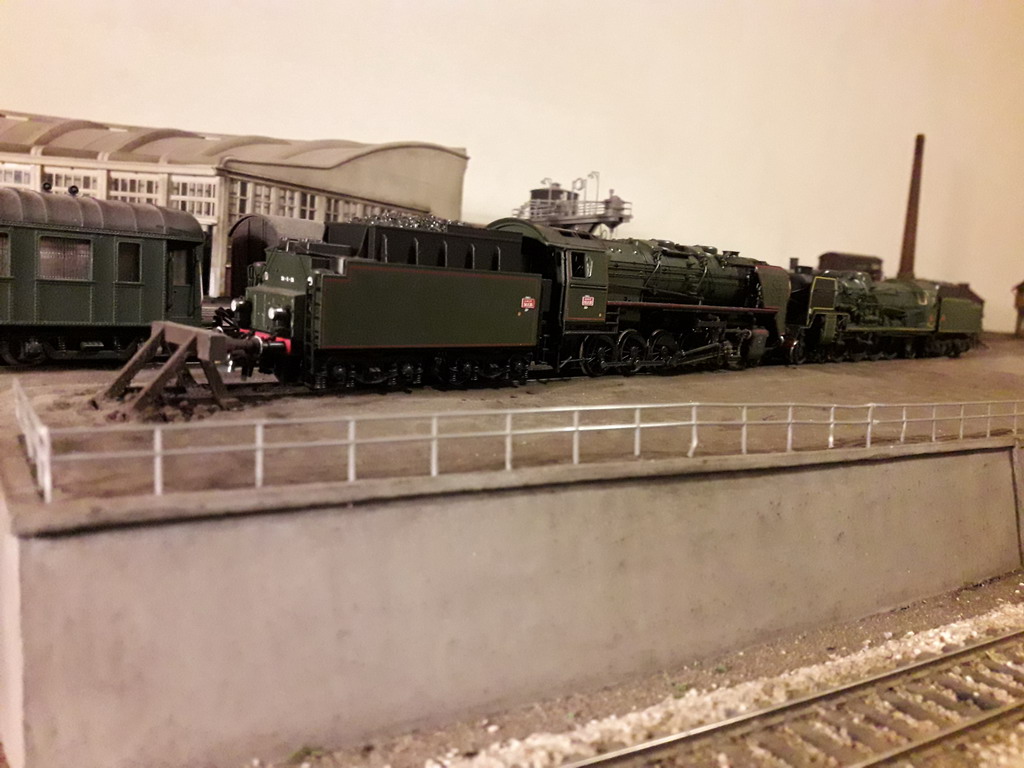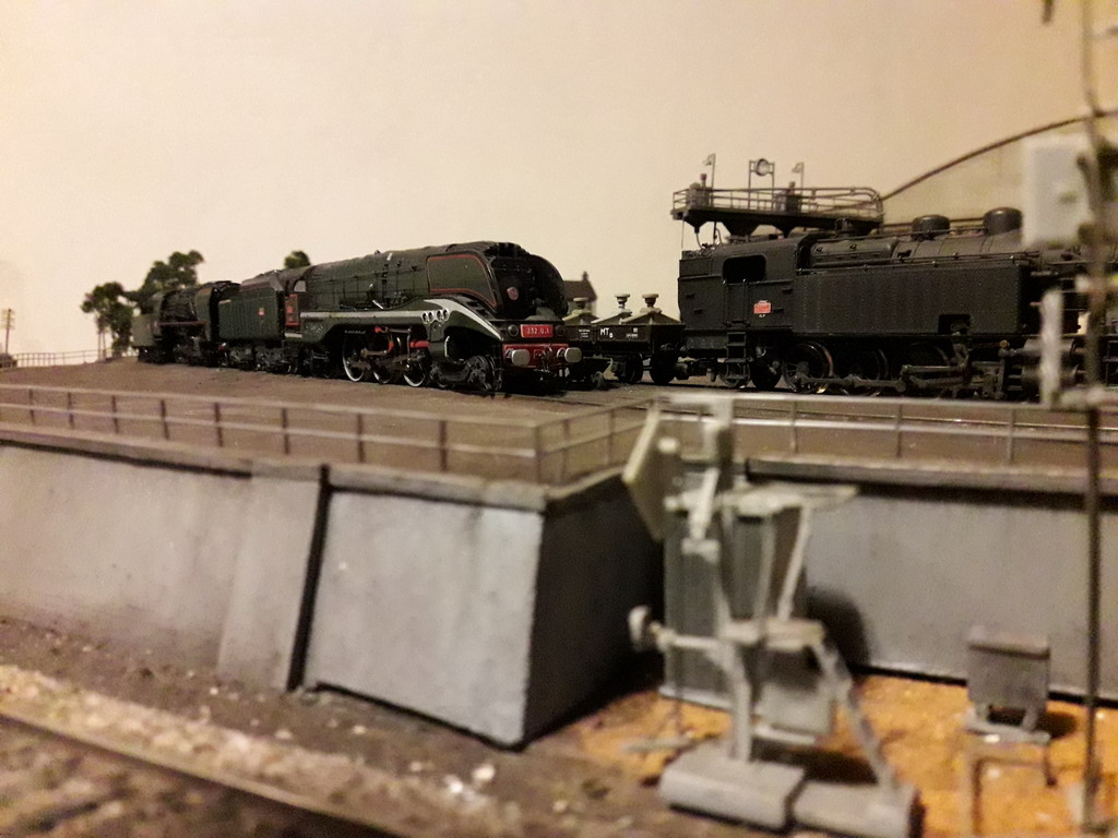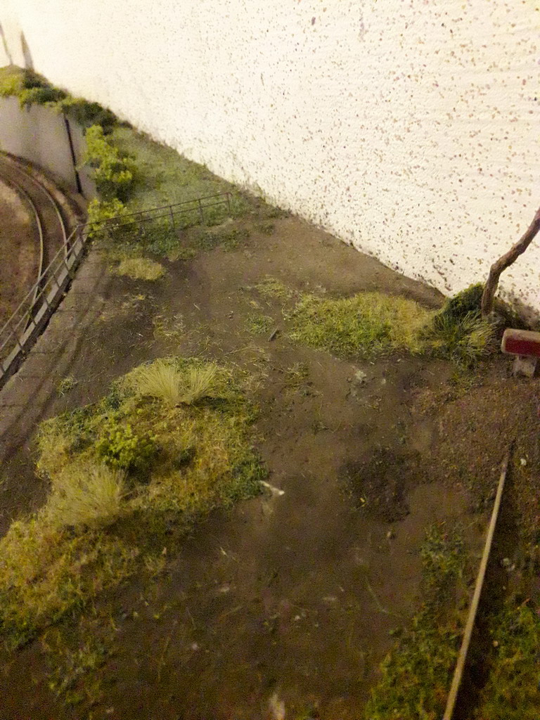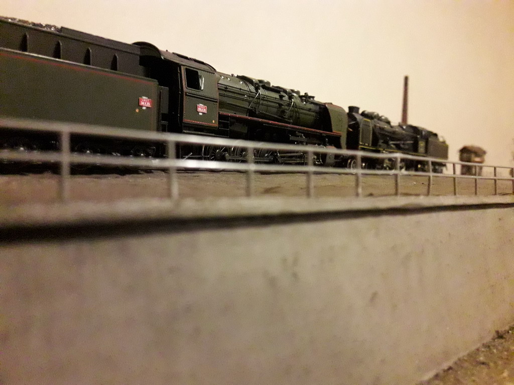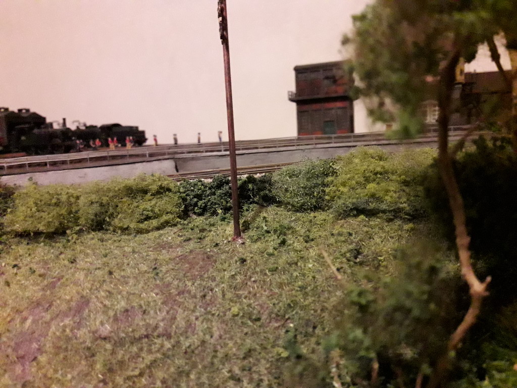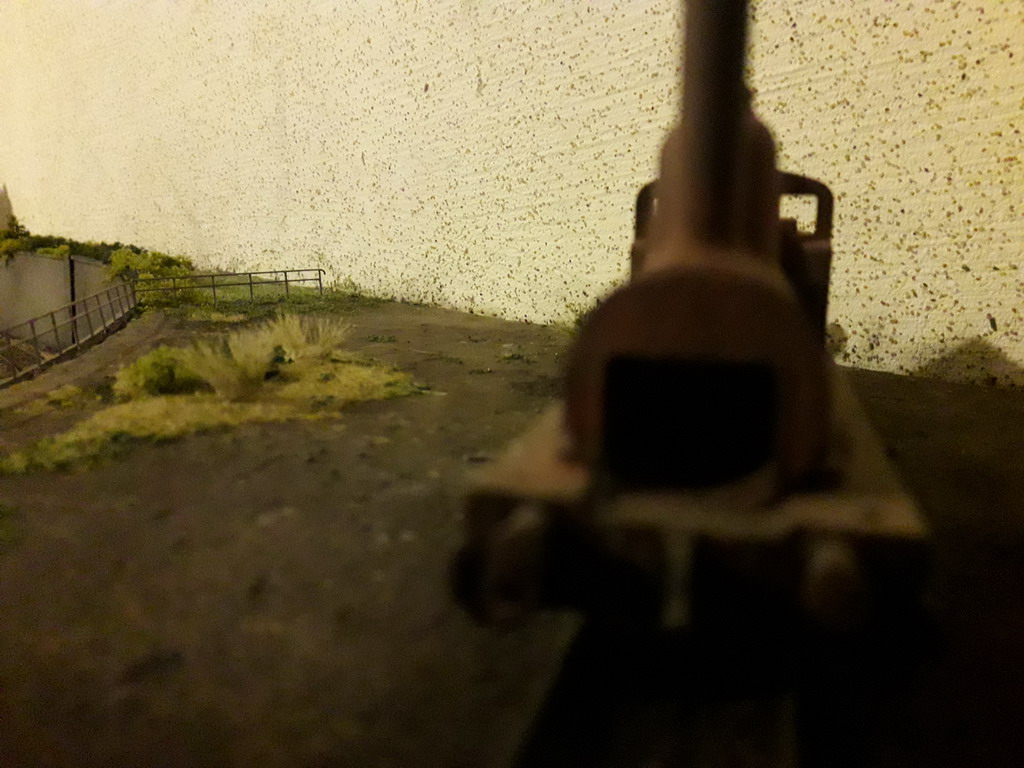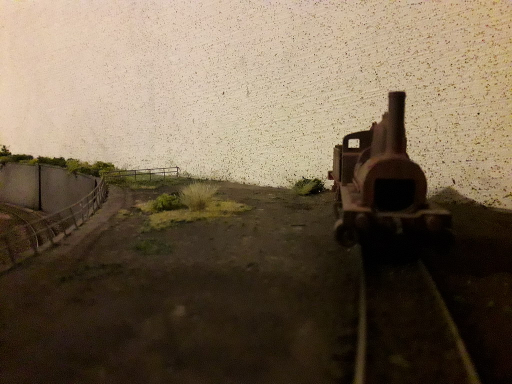 J'ai repris le décor coté dépôt à son extrême limite. Pose de garde fous et végétalisation évidement pas terminée. Il va falloir y figurer un beau bazar bien cracra autour de cette machine radiée. Un fond de décor s'impose. Dommage que le premier plan est flou.