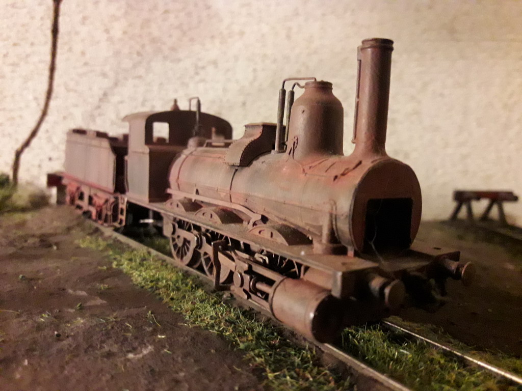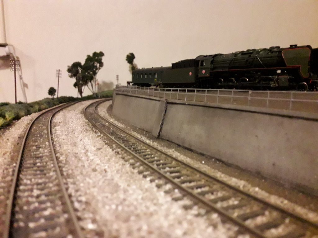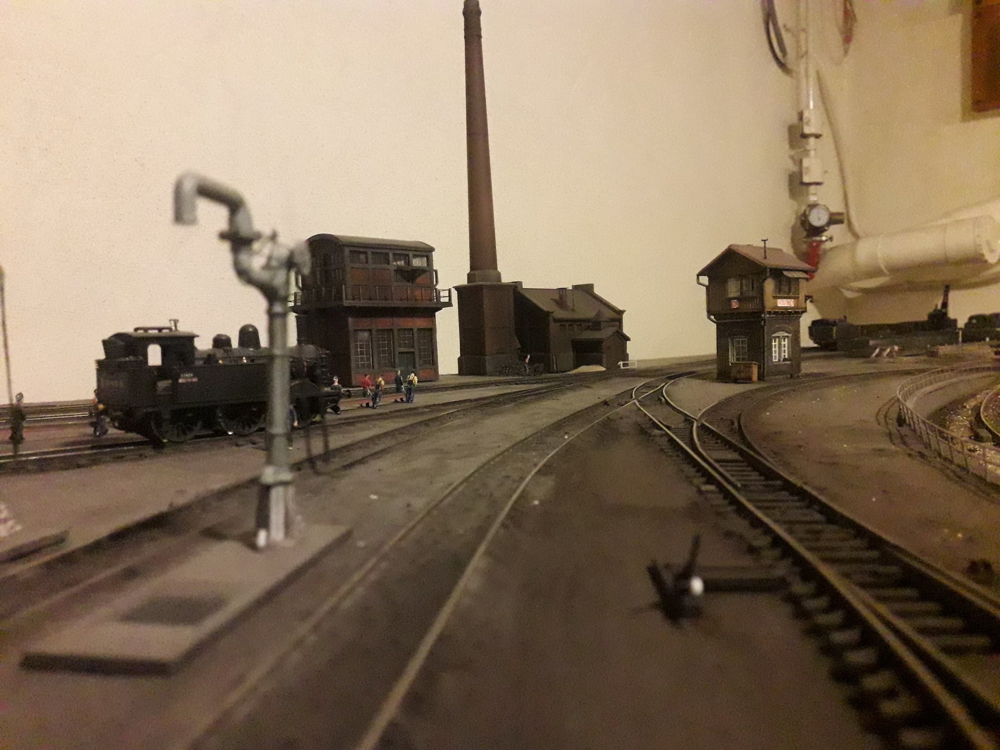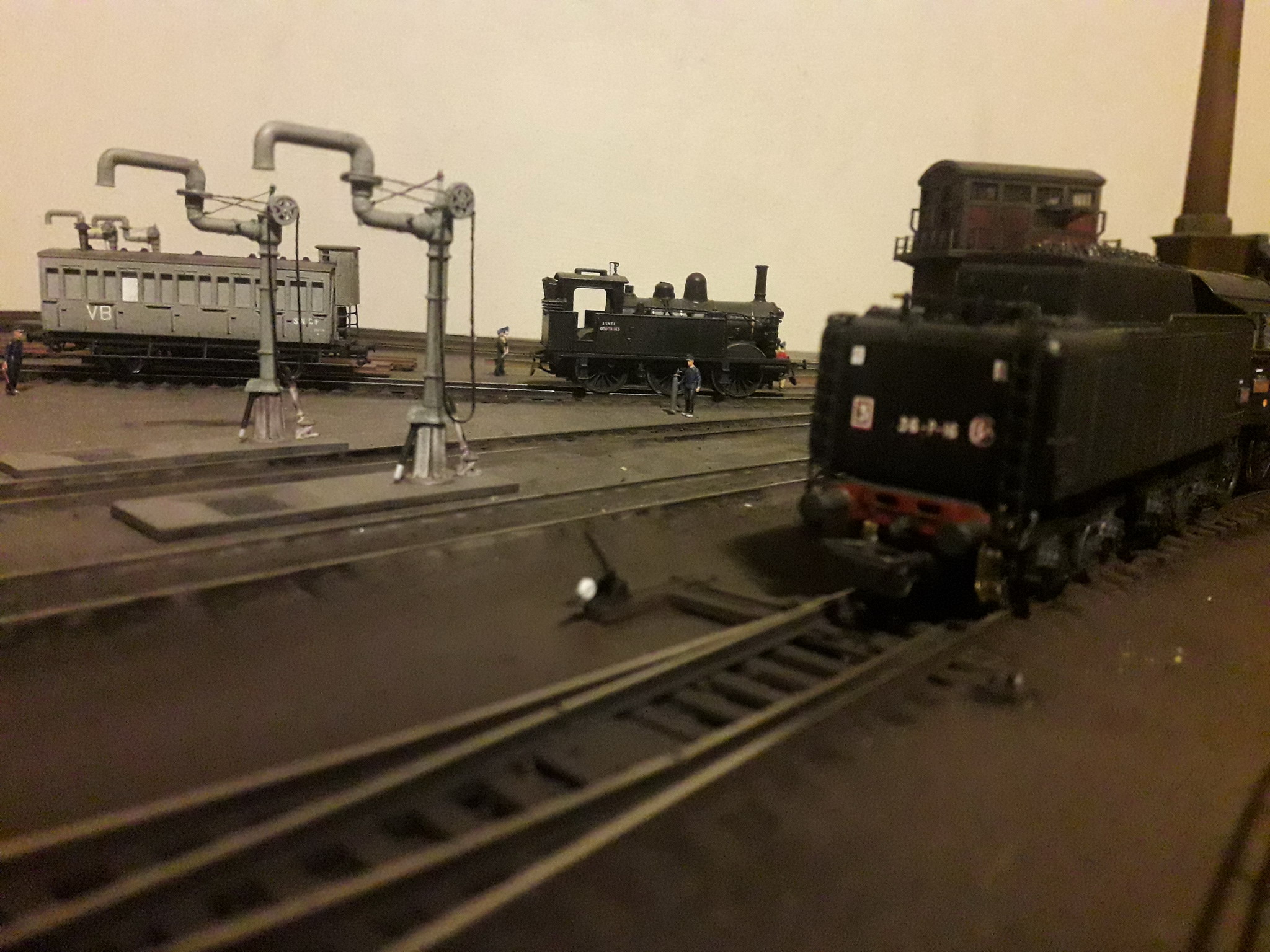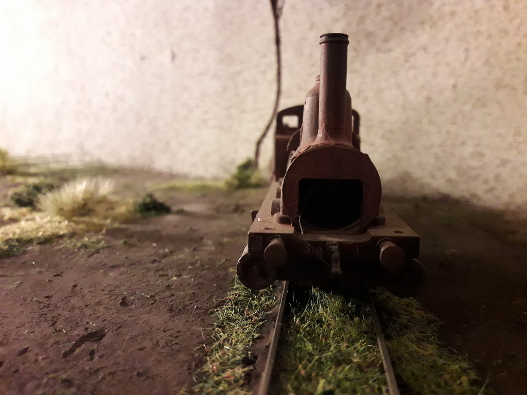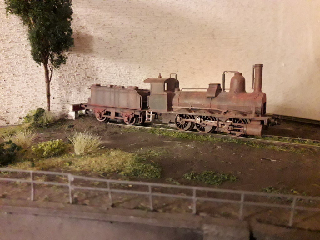 J'ai repris le décor coté dépôt à son extrême limite. Pose de garde fous et végétalisation évidement pas terminée. Il va falloir y figurer un beau bazar bien cracra autour de cette machine radiée. Un fond de décor s'impose. Dommage que le premier plan est flou.