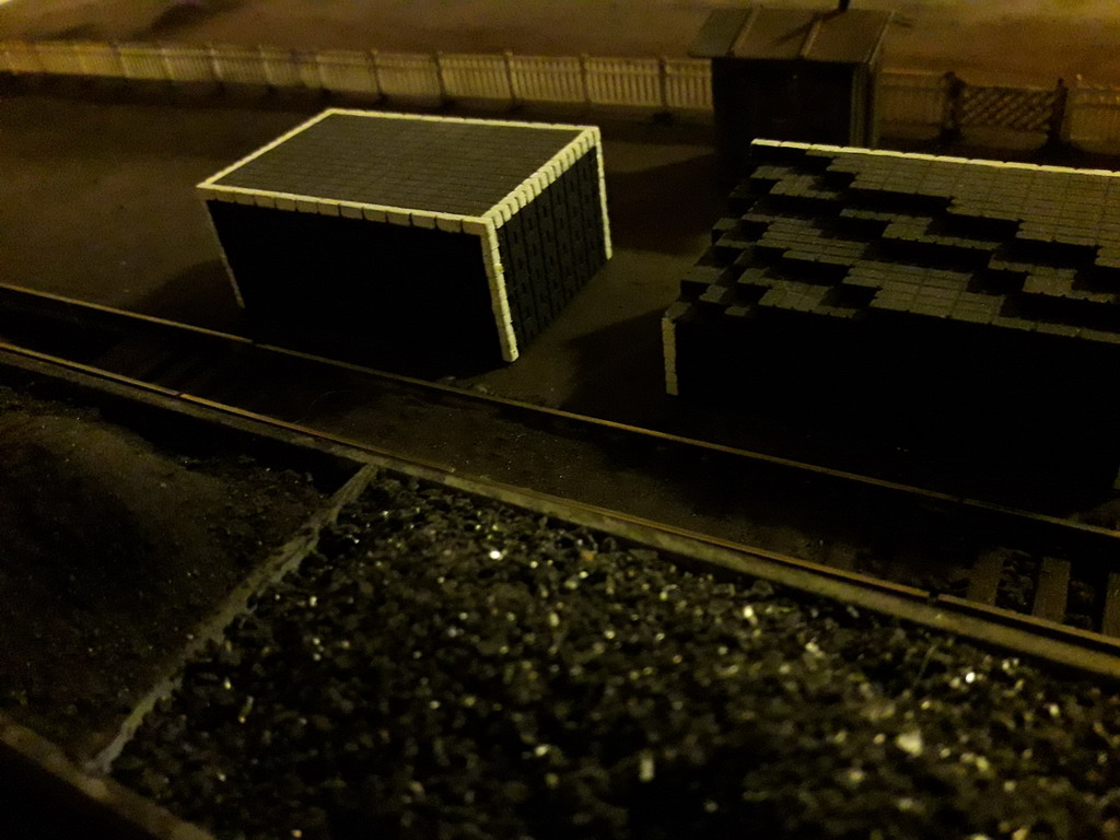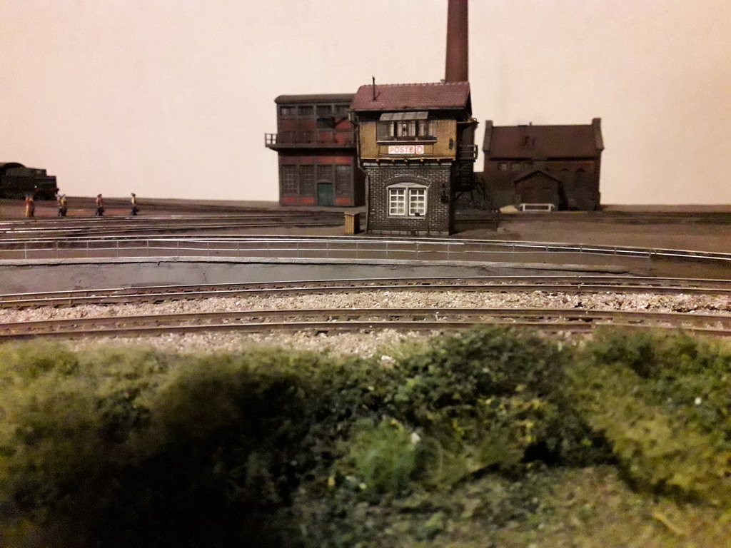Plusieurs chantiers en même temps alors cela n'avance pas beaucoup. Je fais tourner des trains pour tester le câblage et j'ai parfois des surprises. Les 8 voies de la gare cachée sont câblées pour le sectionnement et il y a encore 16 aiguillages. Là je pose la clôture en béton qui ferme le dépôt du coté du parc à combustible. Ce sont les barrières MKD que j'ai récupérées de mon réseau de 1970. J'ai posé provisoirement une baraque de garde car il y a un petit portail d'entrée.