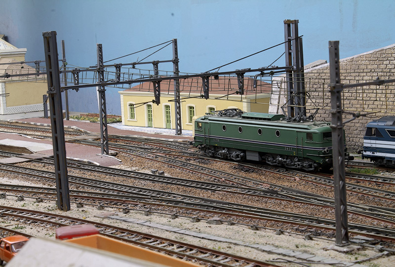 Hier j'ai posé et soudé les 40 cm manquant pour finir l'entrée des deux voies de circulation paires ainsi que les deux voies de service en impasse. Les anti flèche des deux poteau sont posés et les tirs de caténaire tendus. c'est quasiment fini pour cette partie de l'entrée de gare.