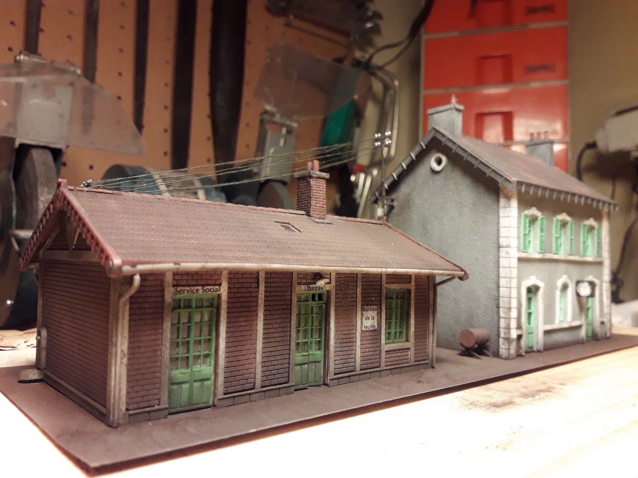 . Donc reprise de la console, recollage, peinture et un petit coup de weathering. Maintenant il n'y a plus qu'à remettre les bâtiments à leur place au dépôt. Le bâtiment de la feuille est une production MKD déjà décrite plus au haut dans ce fil. Acheté d'occase sur la baie, j'ai dû fabriquer la cheminée et refaire les inscriptions