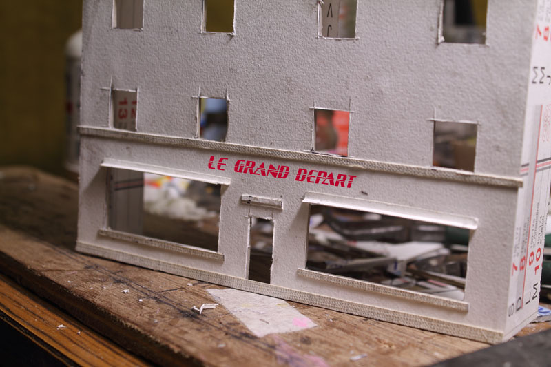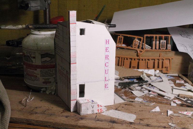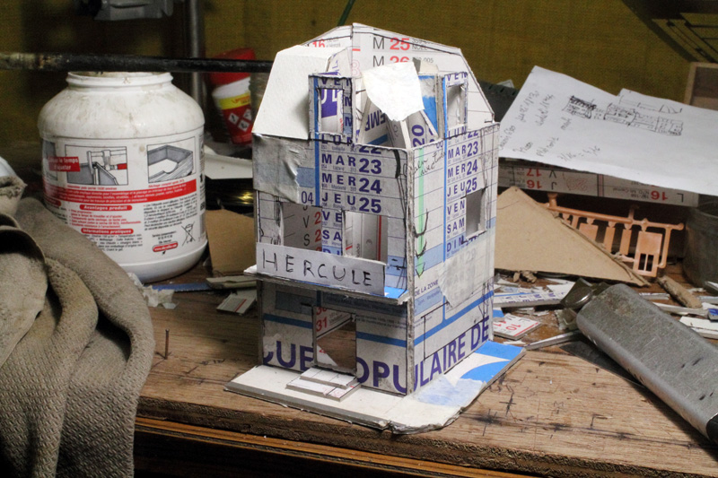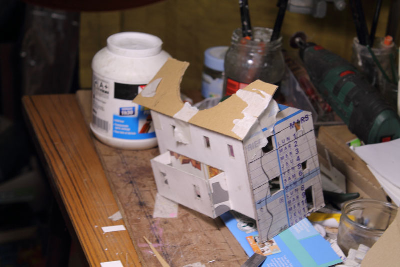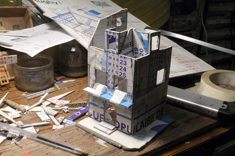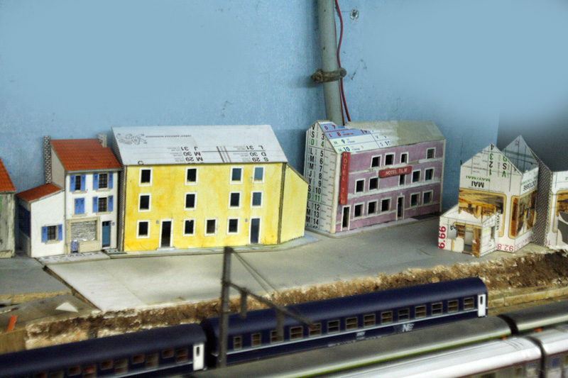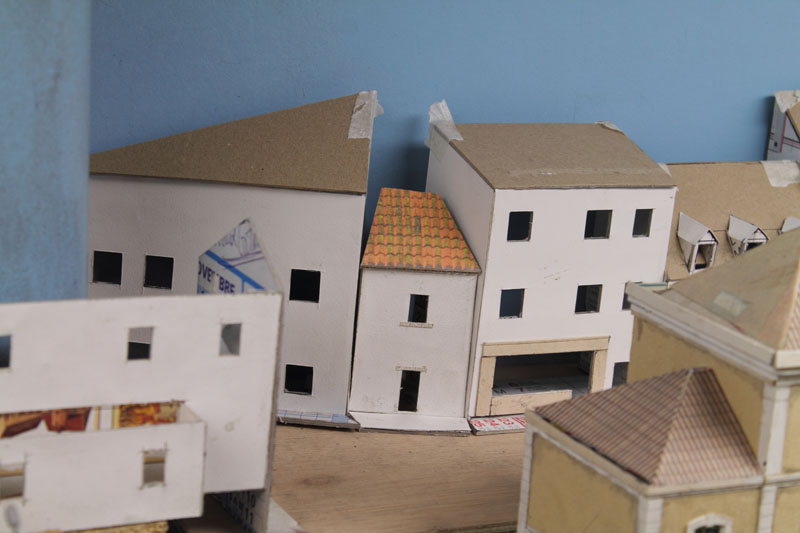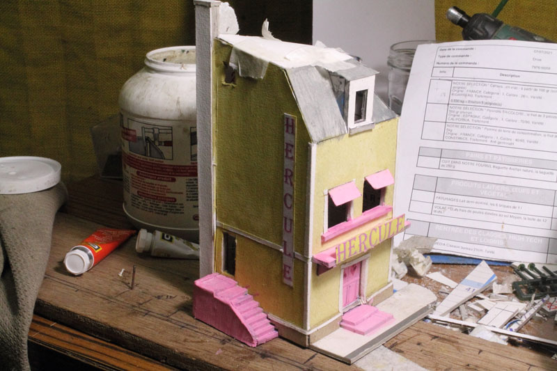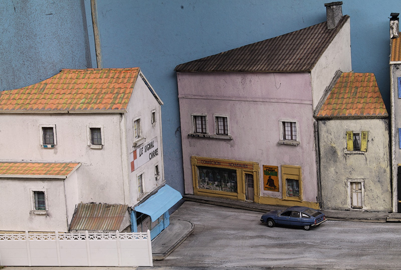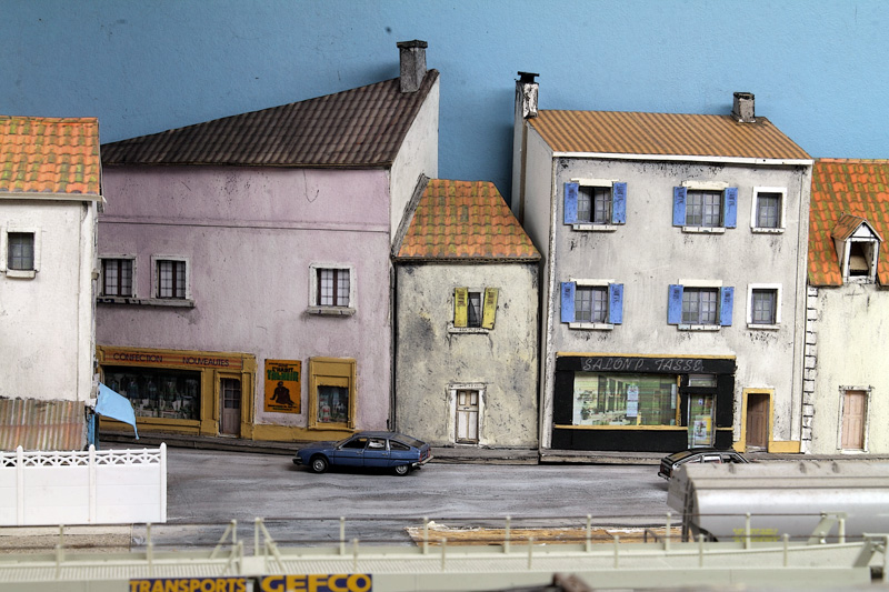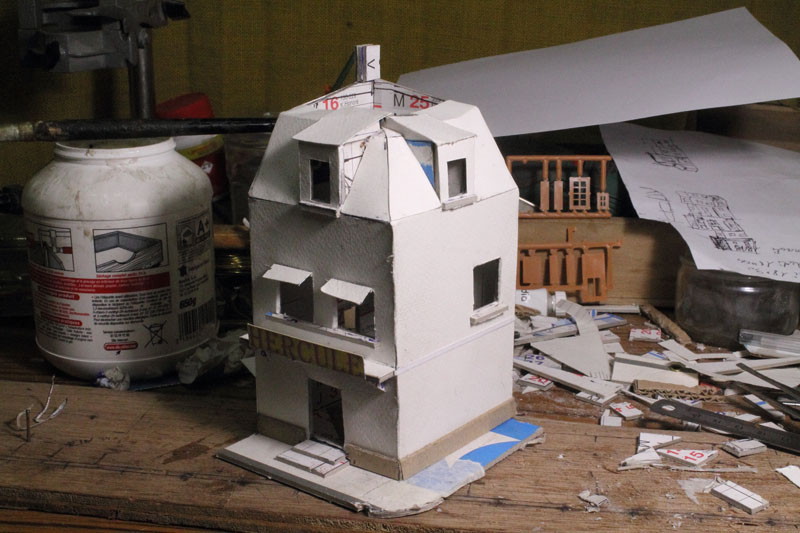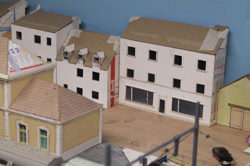 . vite , si on veut, moi ça me parais lent, Découper des petits bouts de cartons de telle épaisseur, coller des petits bouts de papier dessus pour faire un petit relief qui se voit que le nez dessus........ Une chose est sure il n'y aura pas d’aménagement intérieur, rideau aux fenêtres (qui sont encore a imprimer et a découper) pas plus. Quand j'aurais fini mes petits collages sur les façades il restera encore les descentes pluviales a faire. Le plus dur c'est l'inspiration pour les façades, les vitrines, heureusement lorsque je suis en panne je vais prendre ma dose à Soumagnac ça fait du bien !
