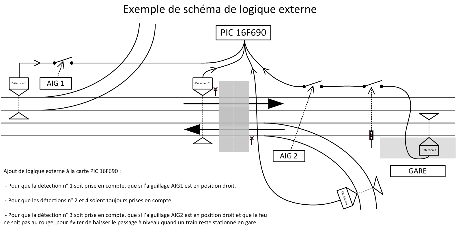 Pour des voies comportant des aiguillages de part et d'autre, des configurations spéciales où les capteurs ne sont pas placés à des distances relativement symétriques, ou avec des aiguillages entre le PN et la barrière IR, il faut ajouter un circuit logique supplémentaire, pour personnaliser la détection.