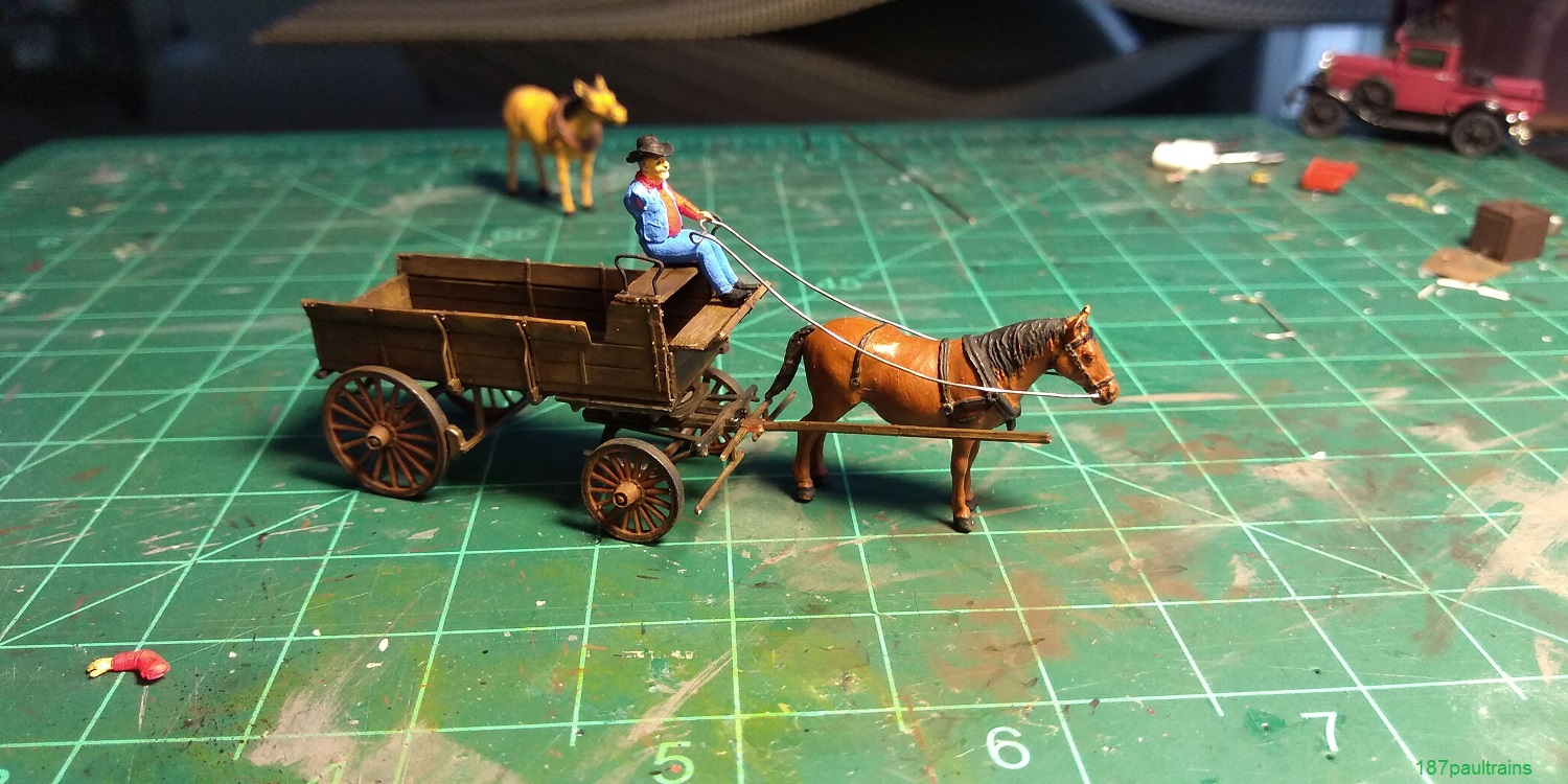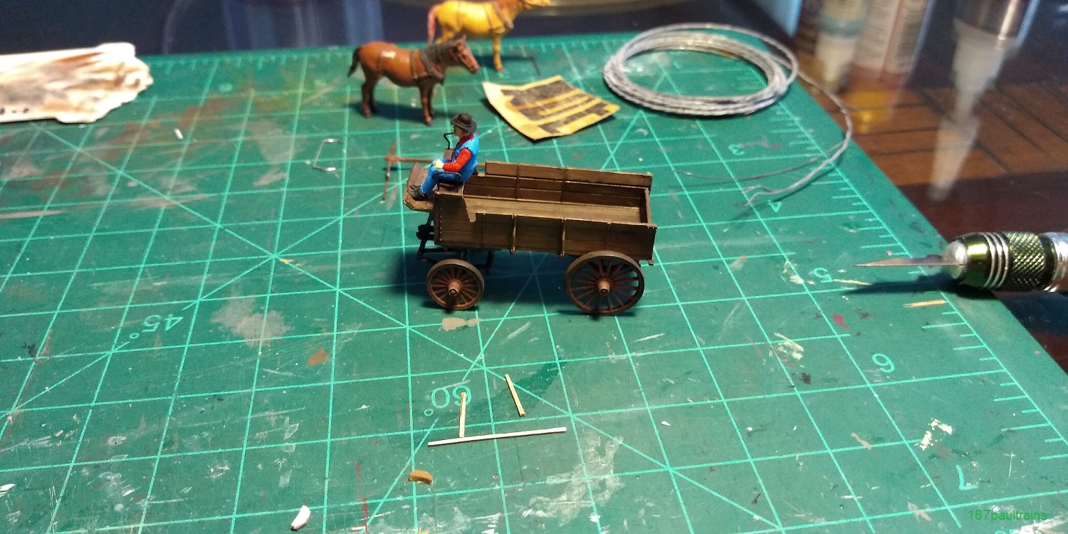 Bon, les sabots sont rabotés donc un peu moins épais. J'ai fabriqué le reste du système de freinage pour que ça ait l'air crédible à partir de petites retailles en bois. J'ai également commencé à assembler le fermier et peint ses vêtements. Il y avait beaucoup de matériel à ébarber mais une fois cette longue et minutieuse étape terminée, le petit monsieur est assez réaliste. Ça donne ça :