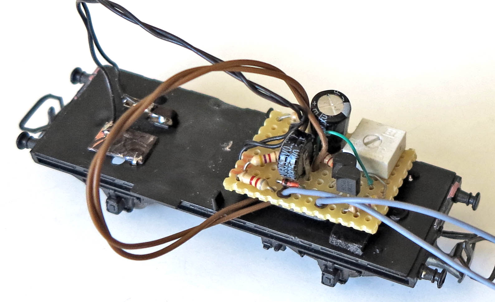 Je viens de réaliser un montage pour mon wagon fourgon Jouef, utilisé sur un circuit classique en alimentation analogique (0-12 Volts).