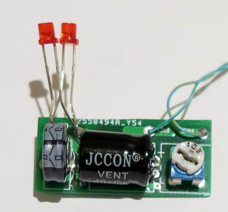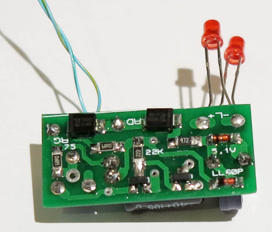 Avec le condensateur de 470µF, On dispose d'une réserve de courant d’une seconde, à luminosité constante. Les feux de fin de convoi seront tout de suite protégés des micros coupures.