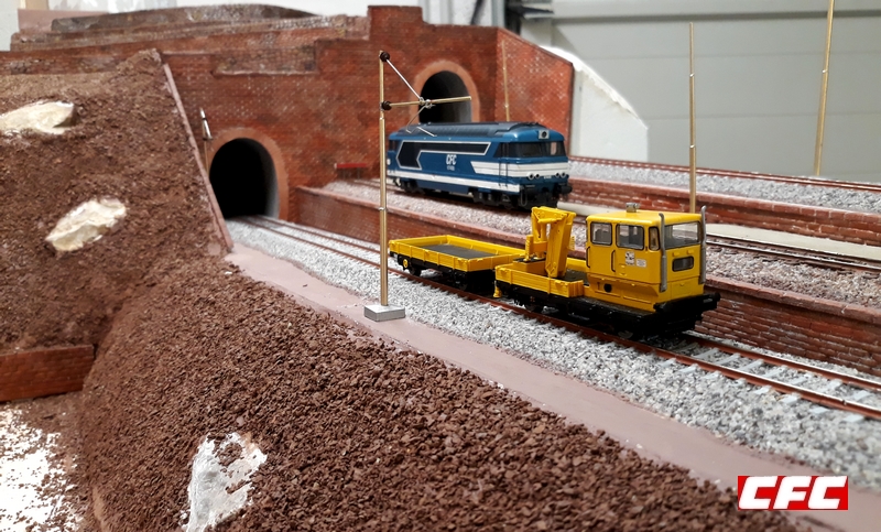 Voici les portails de tunnels en décalé, l'un en rampe (Mounta), un en pente (Cala). Seule la voie est posée, ballastée, les supports de caténaire sont en cours de pose, le décor, notamment la végétation, est en train de pousser.