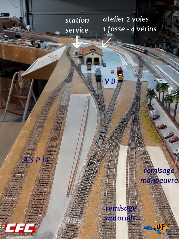 - 1 plateau comprenant 10 voies de service, permettant le remisage autorails (13-15), le remisage du locma (11), réservée VB (28), station-service (22), atelier (24-26), accès Port (30), réservée association ASPIC (31-33).