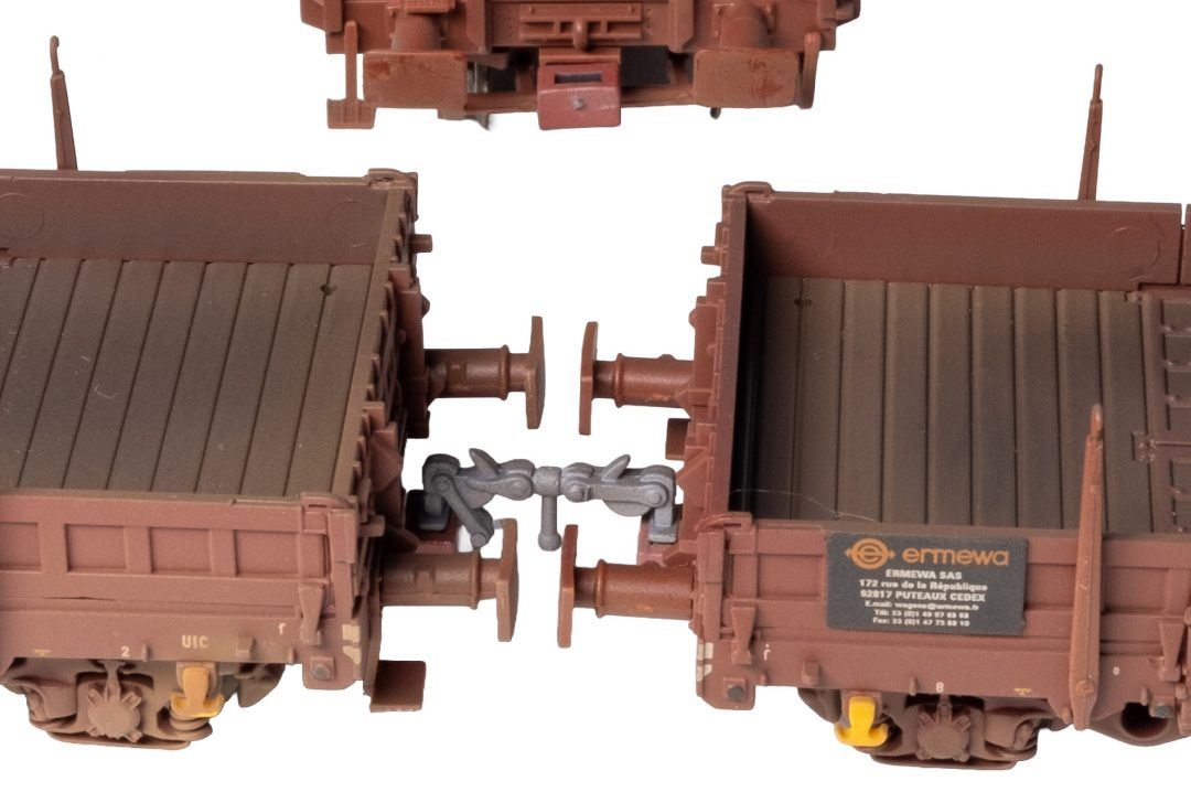 Un attelage R&C monté entre deux wagons Remms de marque Hornby-Jouef. L’écart entre les véhicules est bien sûr sensiblement réduit par rapport à l’attelage à boucle.