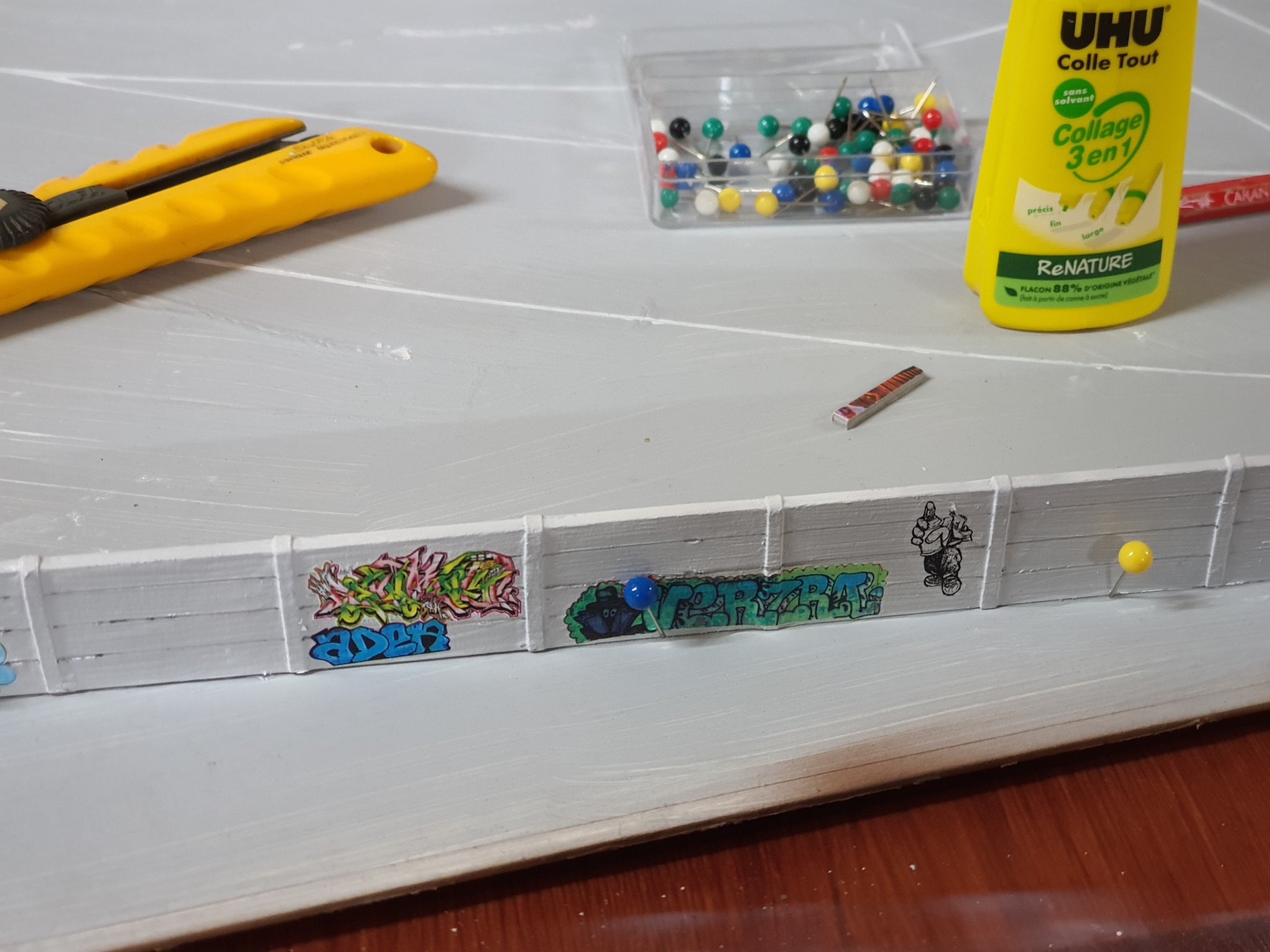 Et enfin un peu de peinture, on trace les lignes pour simuler les plaques de béton, de la terre à décor et du tag