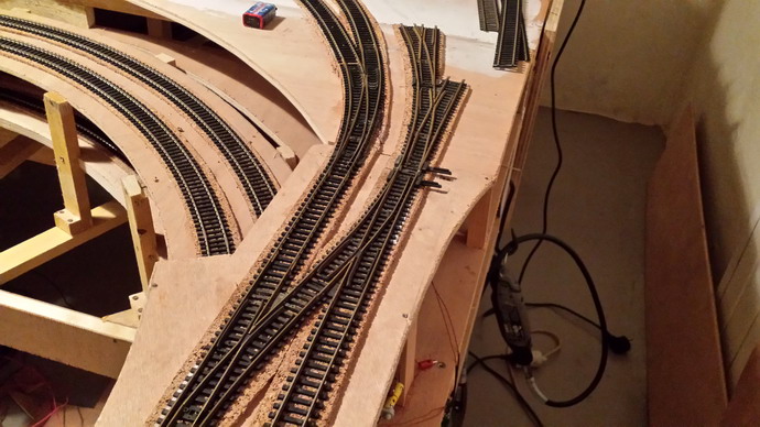 Merci de tes encouragements Didier. Je ne cache pas que parfois il y a des moments de découragement, car j'ai attaqué à gros. Donc je fais (enfin)tourner quelques trains qui d'ailleurs me permet de déceler des anomalies d'exploitation, défauts de connections, défauts de voie et j'en passe et des meilleures. Sans compter les surprises du matériel roulant ( la 150X qui perd un tourillon de bielle et la P28 - que je n'ai pas encore modifiée - qui déraille tout le temps). Le pont tournant que j'utilise souvent m'a causé de beaucoup de soucis. J'ai dû refaire les soudures de connections du moteur du style "tiens! il s'arrête ??? " et on ne trouve pas la cause >:D ...Là je pose mes derniers mètres de voie et encore un aiguillage. J'ai voulu simplifier mes bandes de ballast en liège puisque c'est des longueurs droite et bien j'ai passé plus de temps qu'en deux parties , la colle ne prenant pas correctement. Les voies de débord 5 et6 de la gare marchandise sont posées . Il reste les voies 2 et 2bis la voie 3 et 4. Il reste a trouver la solution de raccordement car cette partie doit se soulever pour installer les moteurs des aiguillages et signaux, la filerie , bref ce n'est pas fini...
