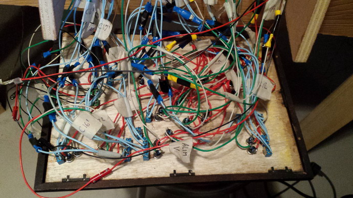 J'ai donc fait une erreur en achetant des boutons poussoirs semblables :redface: en y regardant bien j'ai mal interprété le catalogue. Je n'ai plus qu'à dessouder :'( et remplacer par des jaunes en intervertissant les cabochons vert et me retrouver avec 36 boutons inutilisables. Heureusement que les moteurs Conrad sont "fin de course". Il n'y a que le moteur CASADIO du carré violet qui s'est muté en merguez. :(
