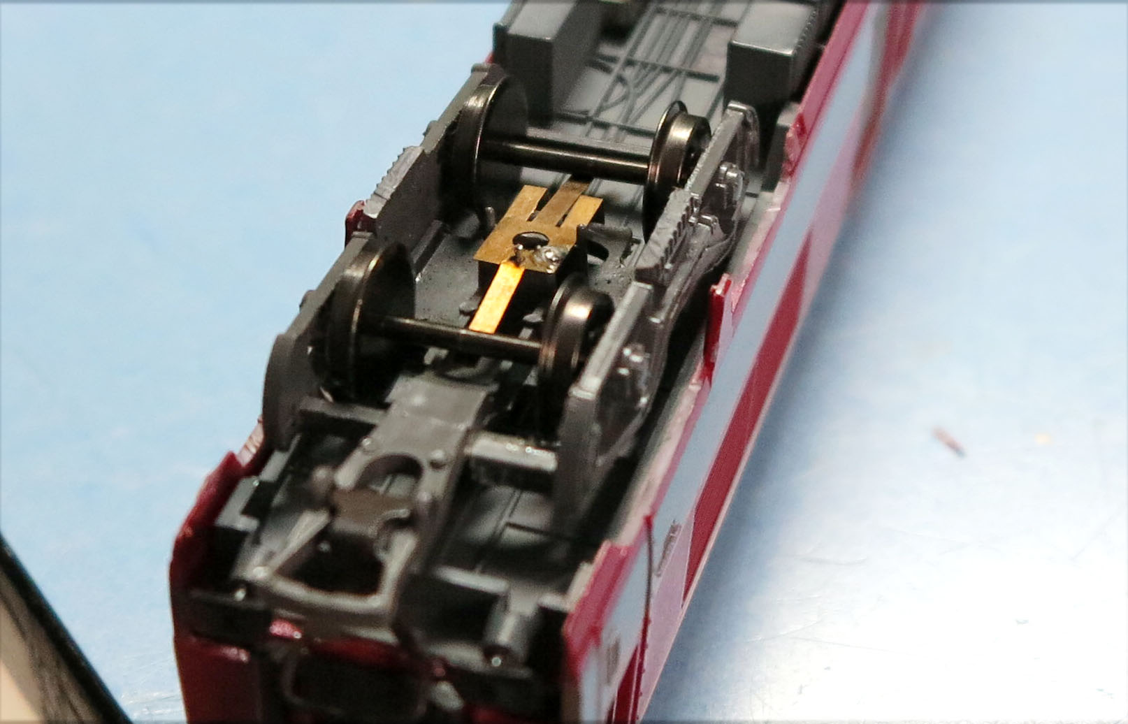 J'en ai profité pour tailler en biais la caisse pour faciliter la rotation des bogies. Depuis, cela déraille nettement moins. La rotation du bogie n'est plus bloquée aussi facilement. Pour bien faire j'aurais du découper ces 3 petites fenêtres du châssis et les coller à la caisse. Cela facilitera les démontages.