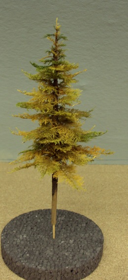 Pour le moment, j'ai juste collé la mousse (le végétal) que j'avais ramassé et séché. Le but était de donner la forme au conifère. Il ne va pas être passé à l'aérographe. Je vais prendre de la peinture Tamiya diluée à 70%. En approchant le pinceau des branches, la peinture va filer par capillarité jusqu'au tronc. J'avais mi quelque part une photo du résultat lors des essais avec Chris68.