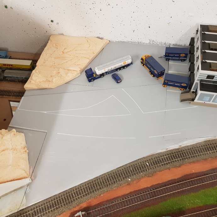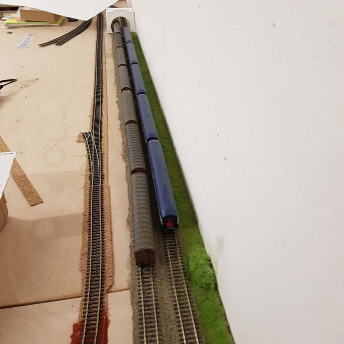 Et mise en place d'herbe sur les bords et contre le mur, et quasi mise en place de la voie qui est parallèle à la double voies