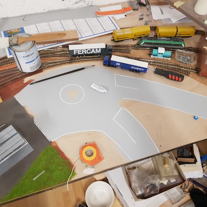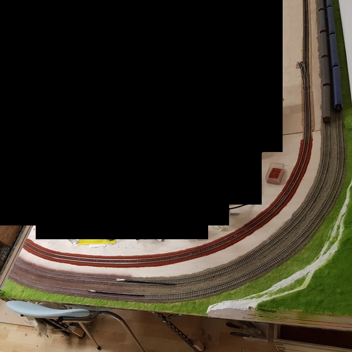 Et mise en place d'herbe sur les bords et contre le mur, et quasi mise en place de la voie qui est parallèle à la double voies