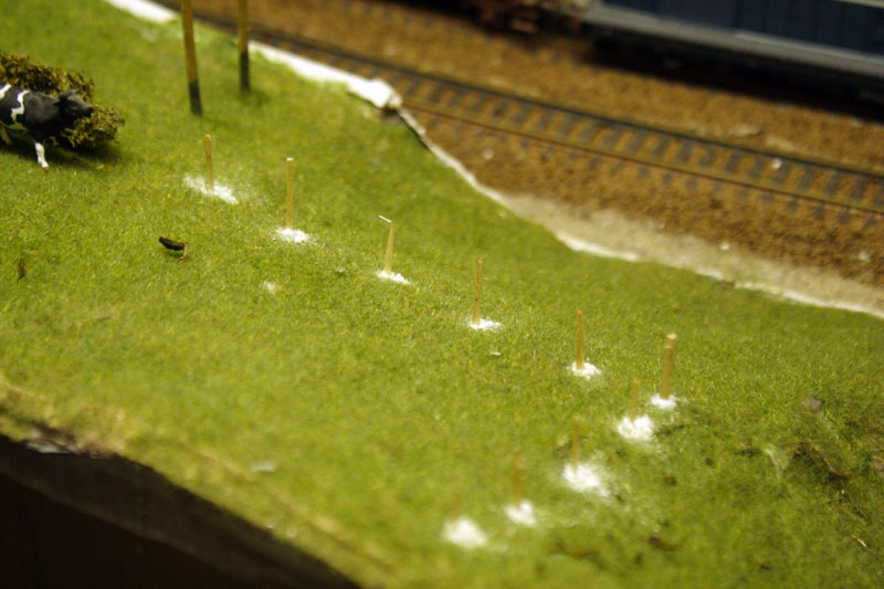 Ur le module il n'y avait pas de clôtures haies etc, ça arrive tout doucement, des petits trous percés tout les 25 mm, des allumettes coupées en deux dans les sens de la longueur puis encore une fois en deux (ainsi qu'une bonne loupe) et découpées à la longueur voulue, du fils de couture volé dans la boite a mon épouse, u peu de cole. Pour les haies le support est en lichen vieux de 20 ans complétement cuit mais servant d'épaisseur pour les haie ensuite recouvert de morceaux de filts floqués des brindilles de thym recouverte de foliage.