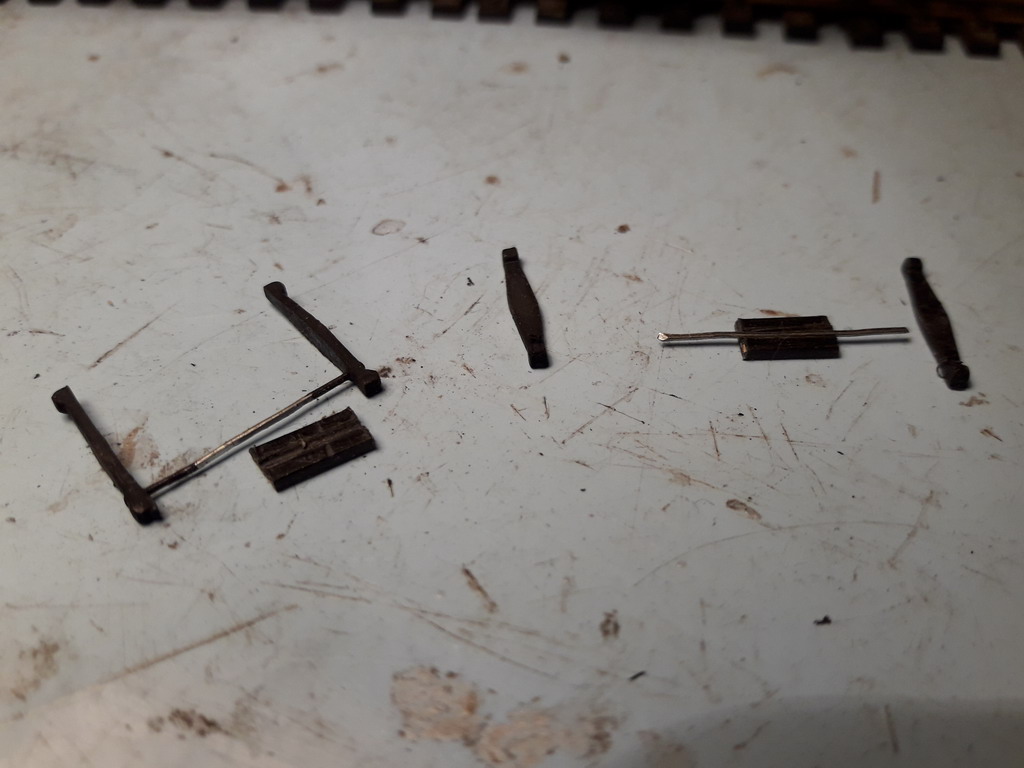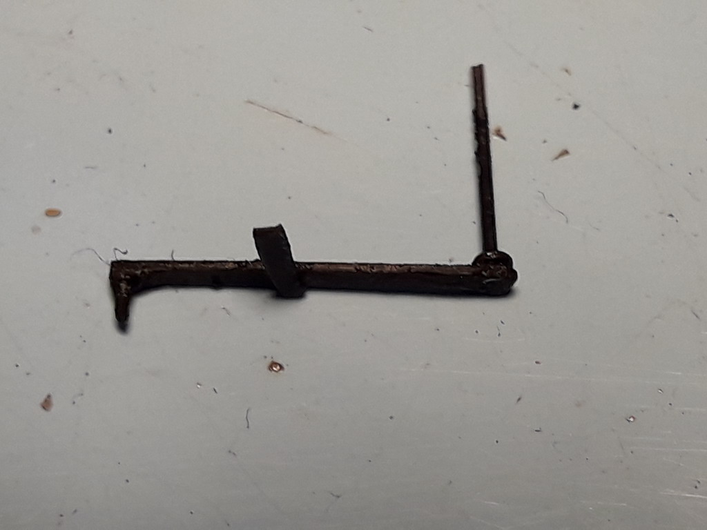 J'ai trouvé le moyen pour les pendules de sabots de frein. Perçage avec un foret de 0.5 et liaison avec une agrafe redressée et collée. La section plate et rectangulaire va me permettre de tailler au trait de scie dans une carte plastique le logement rectangulaire qui me servira de coulisse. Les pendules resteront bien verticaux.