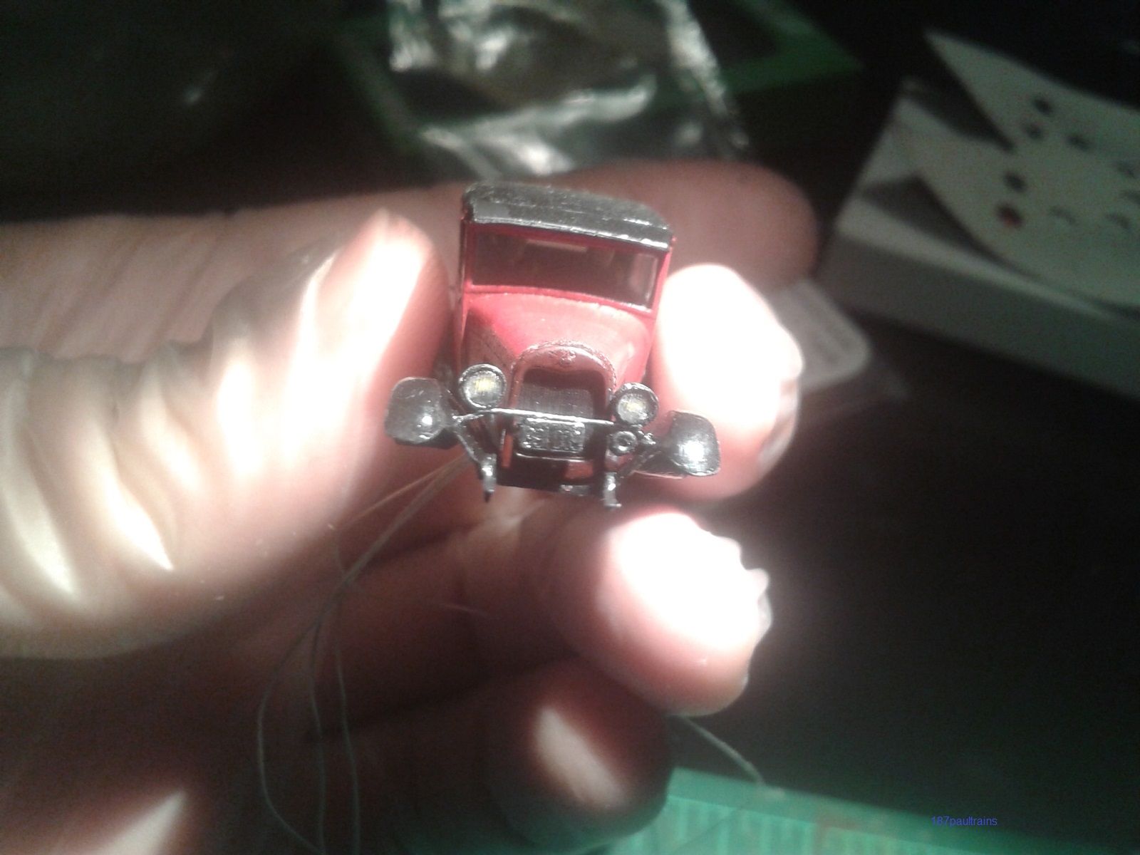 En tout cas, je voulais construire ce modèle pour mon module de la gare "Lac Monique" (Québec, 1930-1940) et y ajouter lumière (phares seulement) et conducteur (pas d'autos dont le conducteur est un fantôme dans mon réseau).