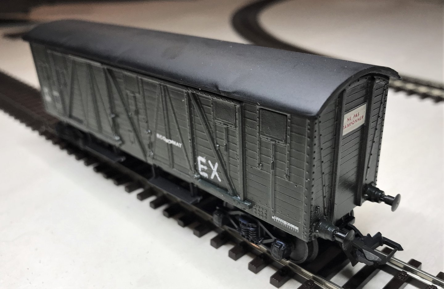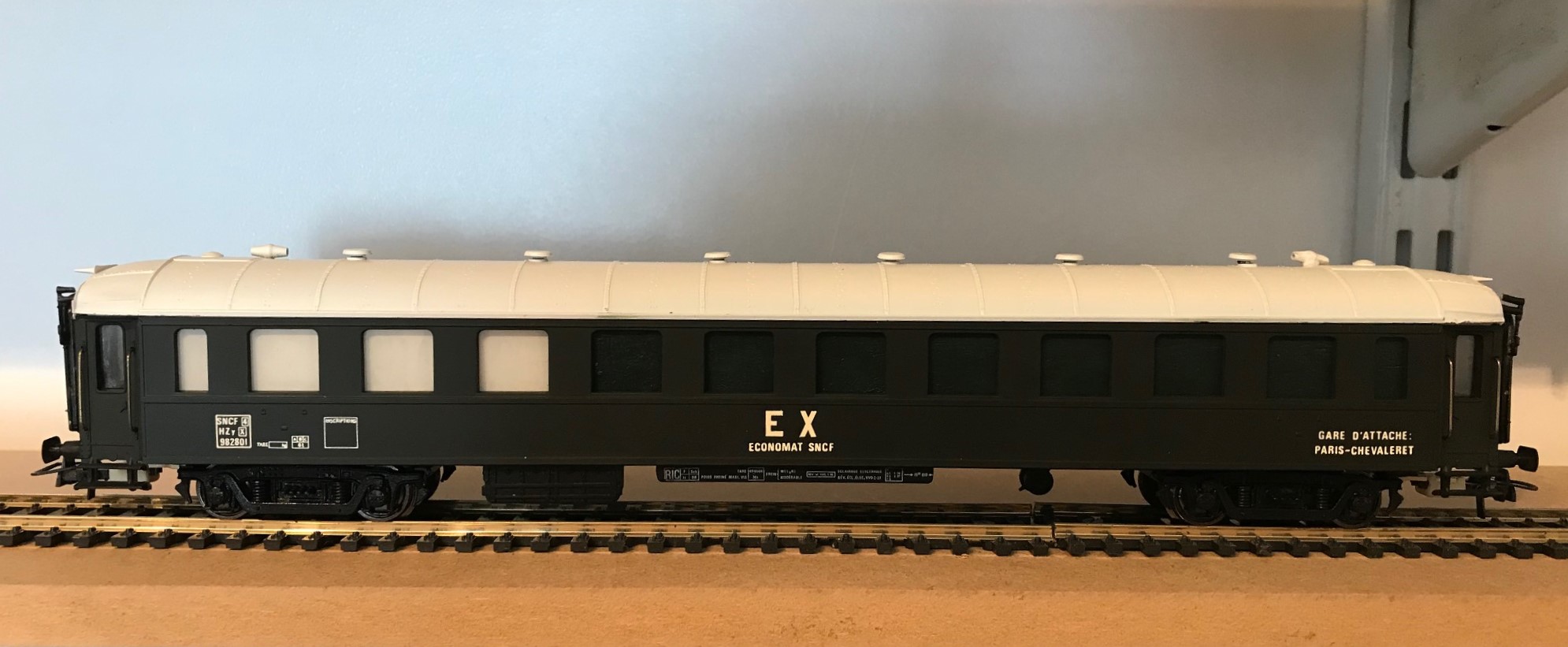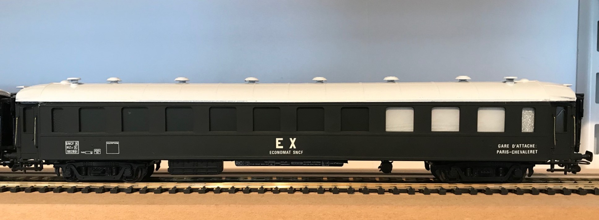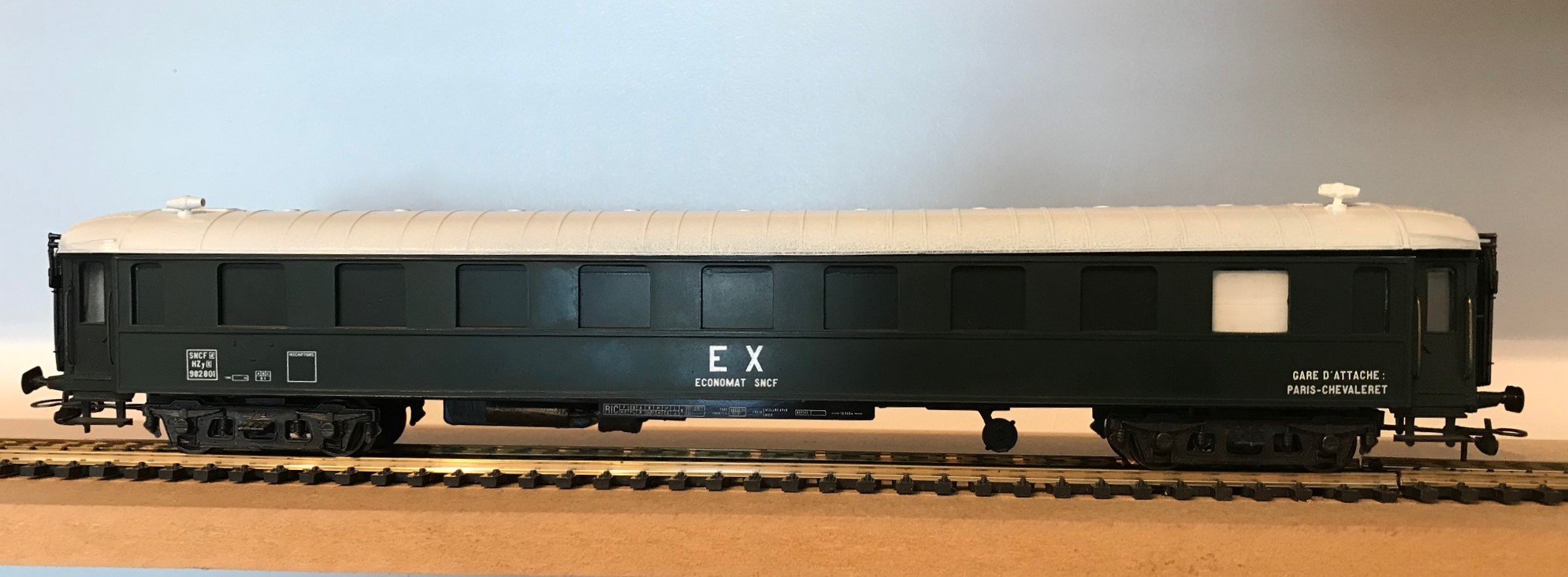 Formule simple et réversible (nettoyage à l'eau): la terre à décor ou poudre de pastel sec. Fixation avec un vernis mat ou satiné pour patine définitive. La méthode est la même que pour les locomotives (voir la patine sur ma 141R1264) sauf quelques touches de peinture ou autre si on veut de l'effet appuyé (graisse, rouille...). En général, le matériel voyageur est entretenu et la patine légère. Moins pour le matériel de service. surtout en fin de carrière pour les ECONOMAT concurrencés par la naissance des supermarchés à la fin des fifties.