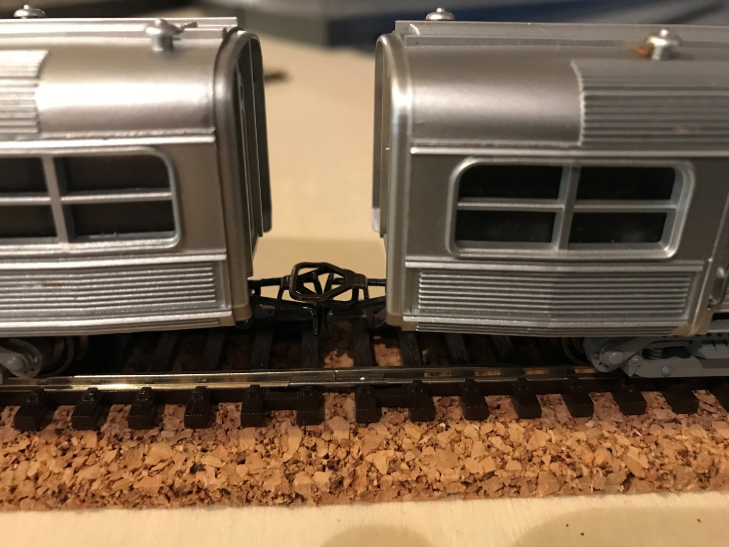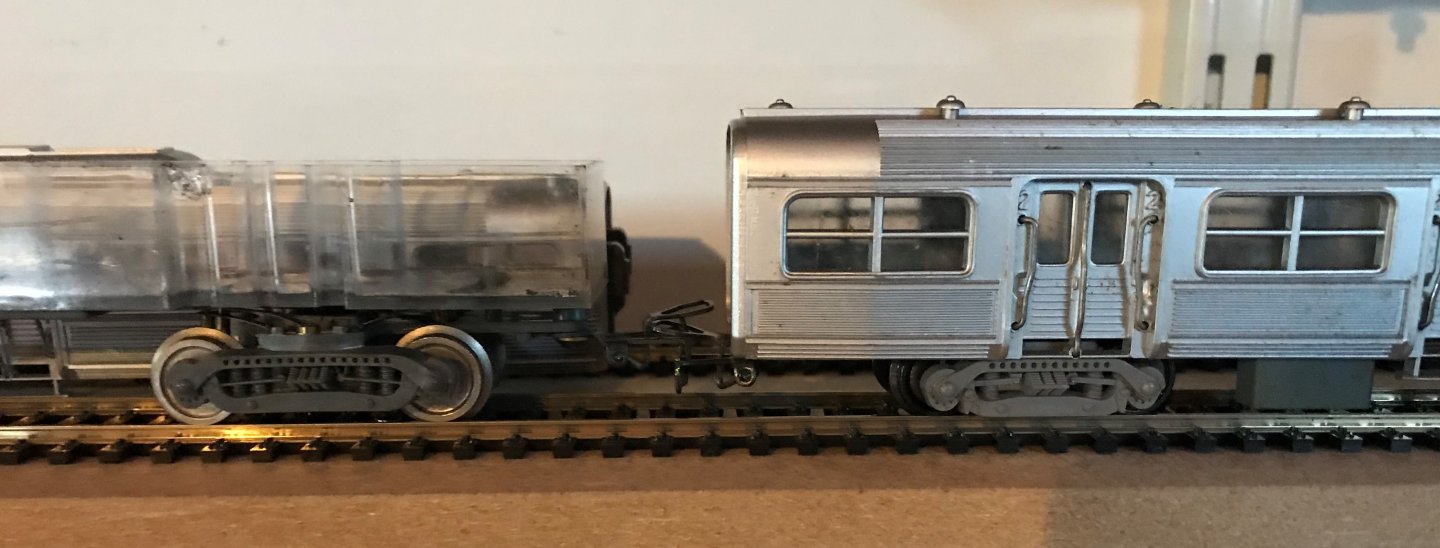 J'ai traité le problème des attelages inter-remorques et j'ai retenu la solution avec des boitiers SYMOBA et des attelages magnétiques REE. J'ai fait des tests avec du double face pour faire des essais dans différents rayons de courbure.En final, les boîtiers seront collés à l'araldite.
