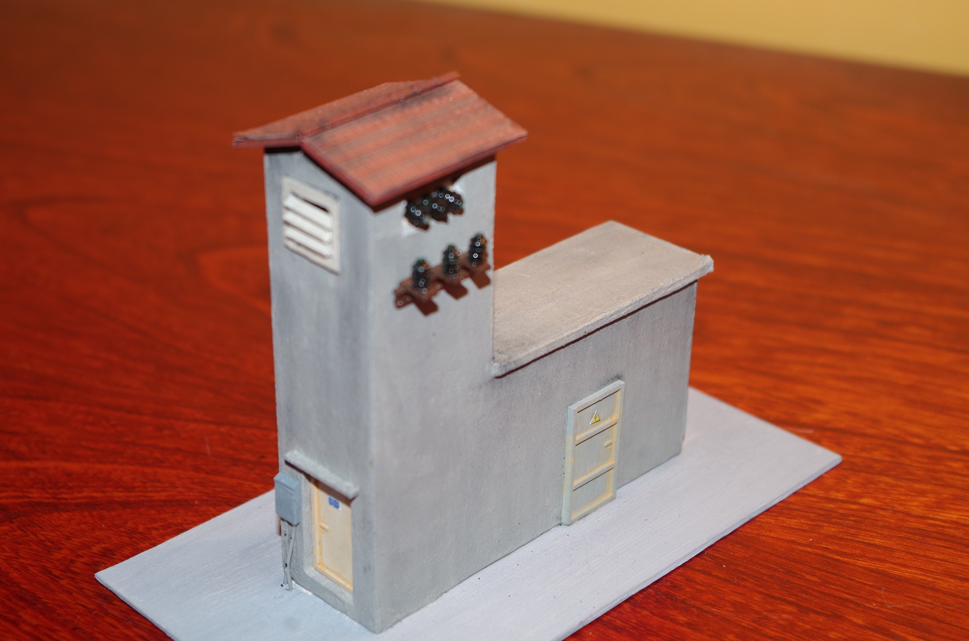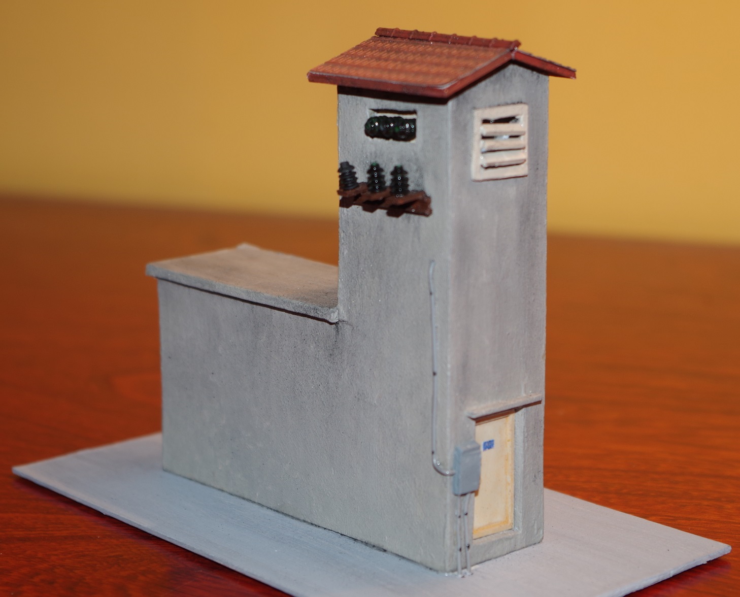 Le bâtiment est en carton de calendrier bancaire de 2 mm d'épaisseur. Les portes, les ailettes de l'aérateur et les supports des isolateurs horizontaux sont en carte plastique de 1mm. Les entourages des portes sont en profilés Evergreen réf 110 et 132. Les platines supportant les isolateurs verticaux sont des profilés H d'Evergreen je n'ai pas la référence. Le toit est en carton de 1,5mm d'épaisseur sur lequel j'ai fixé des tuiles Redutex réf R087TF113, les tuiles faîtières de marque Décapod réf 5962. Les isolateurs récupérés d'un stock ancien. Les câbles électriques d'un diamètre de 1,5mm.