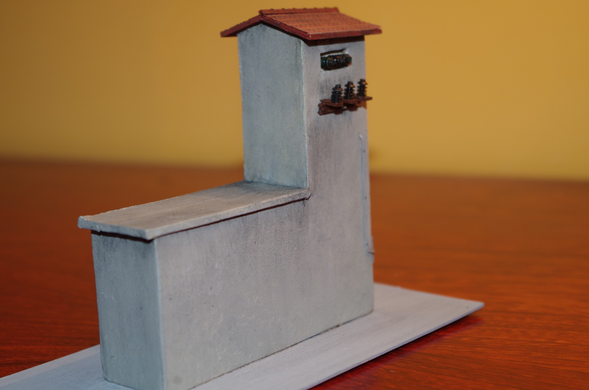 Le bâtiment est en carton de calendrier bancaire de 2 mm d'épaisseur. Les portes, les ailettes de l'aérateur et les supports des isolateurs horizontaux sont en carte plastique de 1mm. Les entourages des portes sont en profilés Evergreen réf 110 et 132. Les platines supportant les isolateurs verticaux sont des profilés H d'Evergreen je n'ai pas la référence. Le toit est en carton de 1,5mm d'épaisseur sur lequel j'ai fixé des tuiles Redutex réf R087TF113, les tuiles faîtières de marque Décapod réf 5962. Les isolateurs récupérés d'un stock ancien. Les câbles électriques d'un diamètre de 1,5mm.