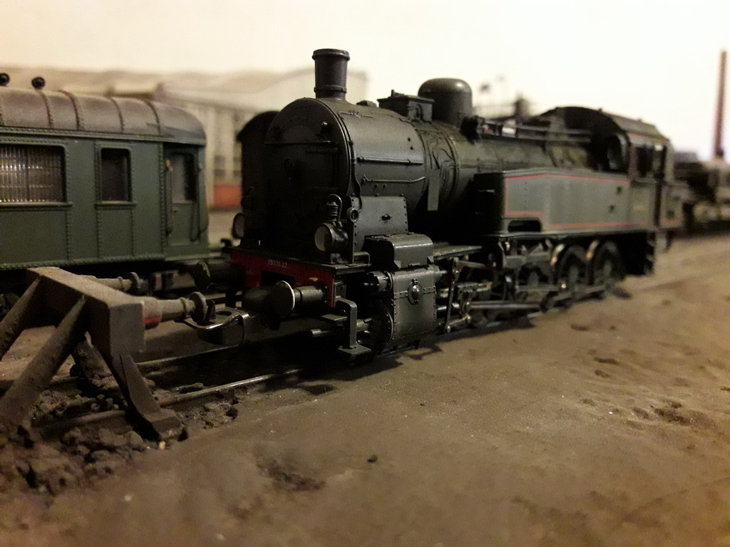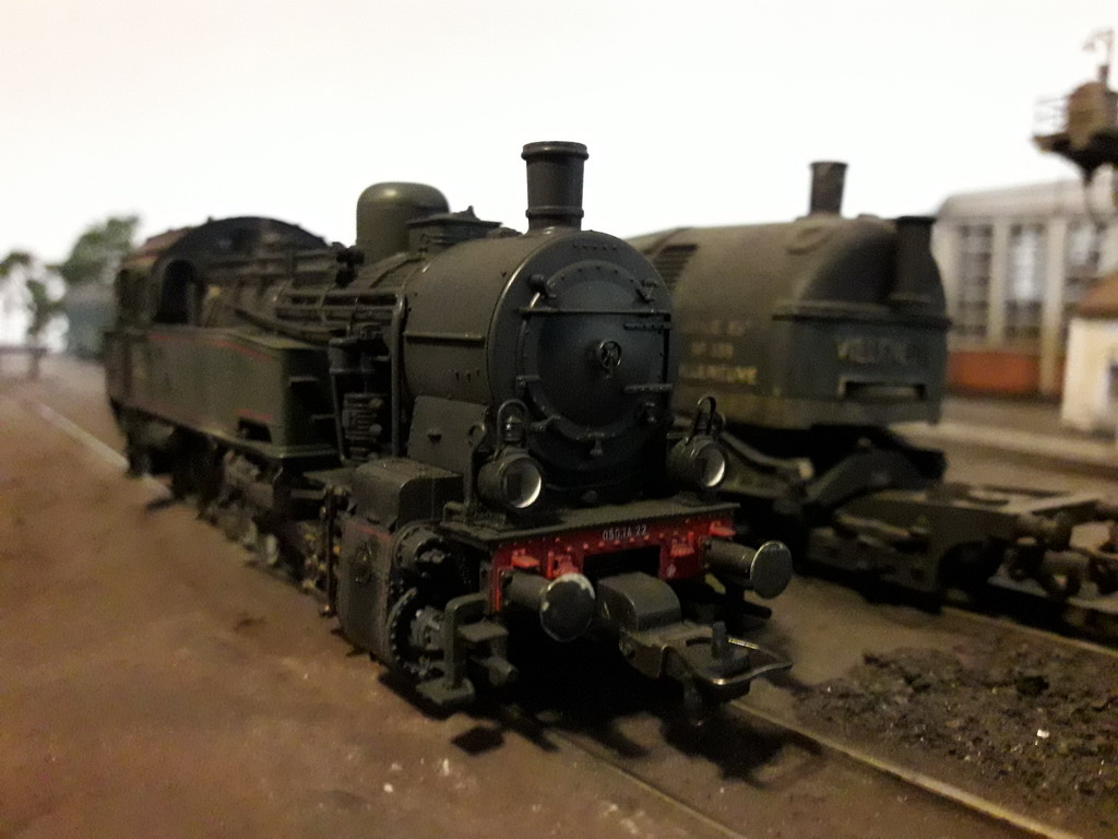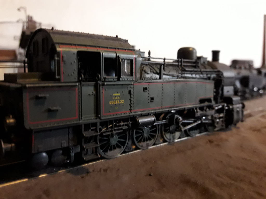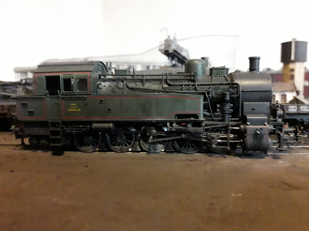 En attendant, retour sur la 050 TA22 Fleischman. C'est le modèle sans bandages d'adhérence. Suite à une réparation d'une lamelle de courant, je lui ai fait une "toilette": Poudre de pastel sec de madame appliquée au pinceau pour aquarelle (Noir, blanc et ocre jaune). Peinture du toit (Humbrol 33) est des bielles (Humbrol 33 + 145 + huile moteur