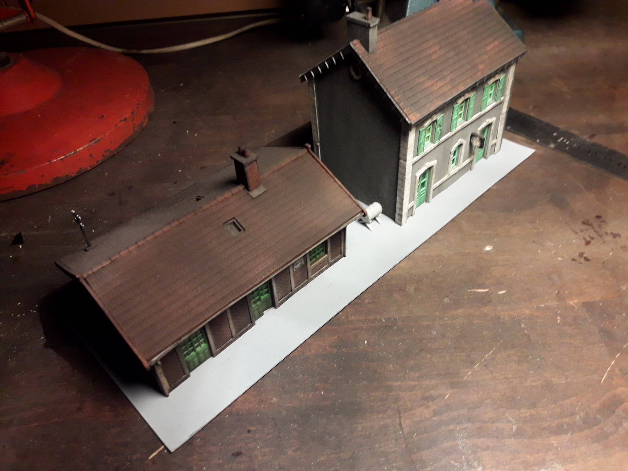 Ayè j'attaque...Comme le foyer des roulants et le bureau de la feuille n'étaient pas collés, je leur destine une aire en béton taillée dans du papier de verre grain 600 peint en gris béton (peinture d'apprêt pour carrosserie automobile)