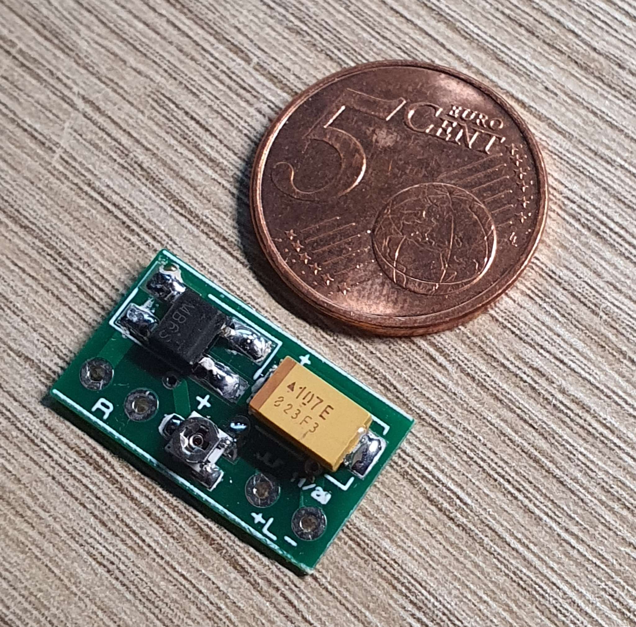 Le circuit de base n'a pas besoin d'un gros condensateur, ce qui lui permet d'avoir de faibles dimensions : 5 * 12 * 21 mm.