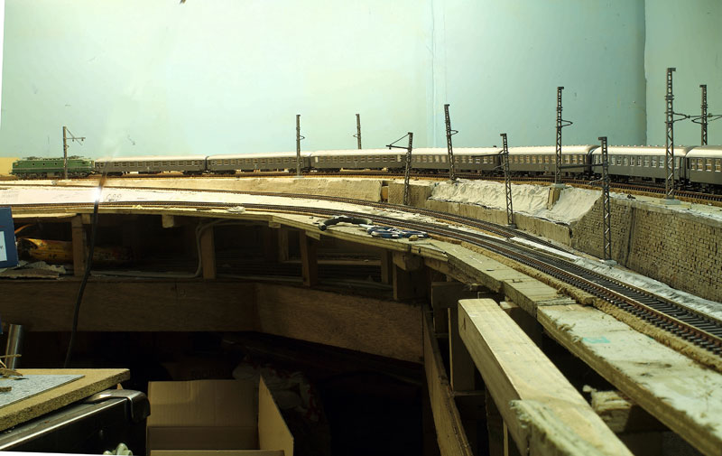 vue d'ensemble, le ballastage est presque fini, l’emplacement des poteaux caténaires quasi définitif. (la cave est pleine)