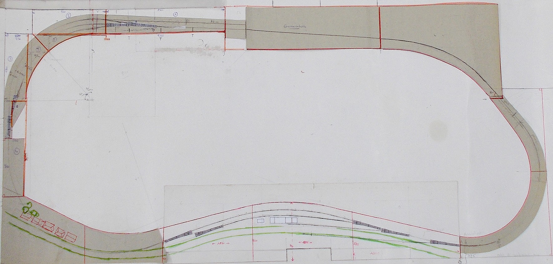 La voie en courbe du fond avec 2 coupures me permettra de stocker 2 rames d’1 m chacune, la voie du milieu me servira de voie de passage, la première coupée en 3 segments de 45 cm assurera le rangement des rames courtes ou des autorails.