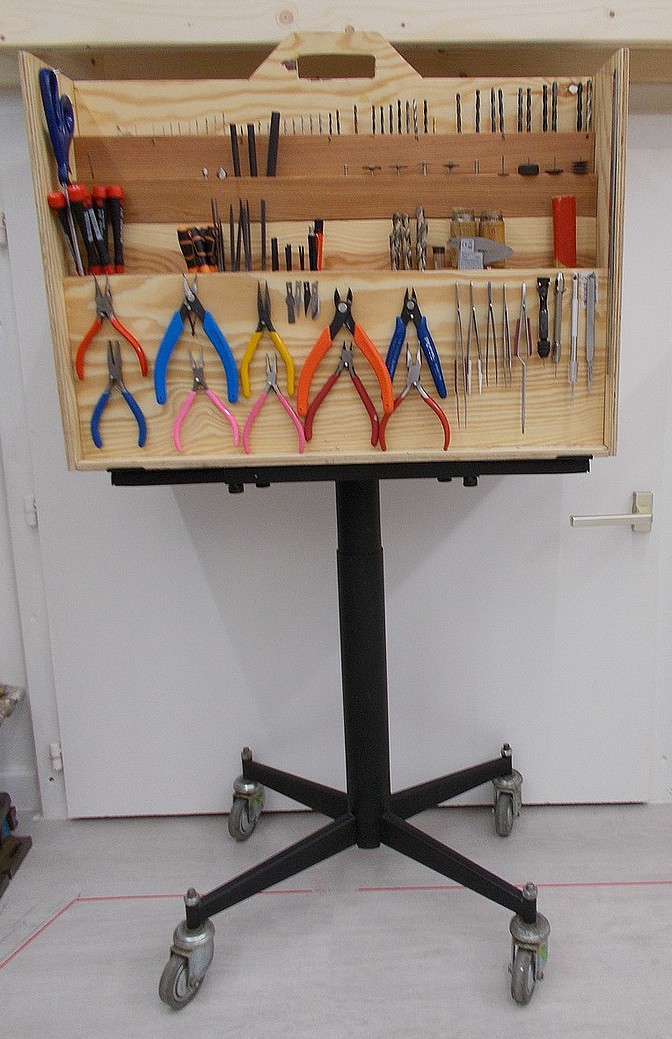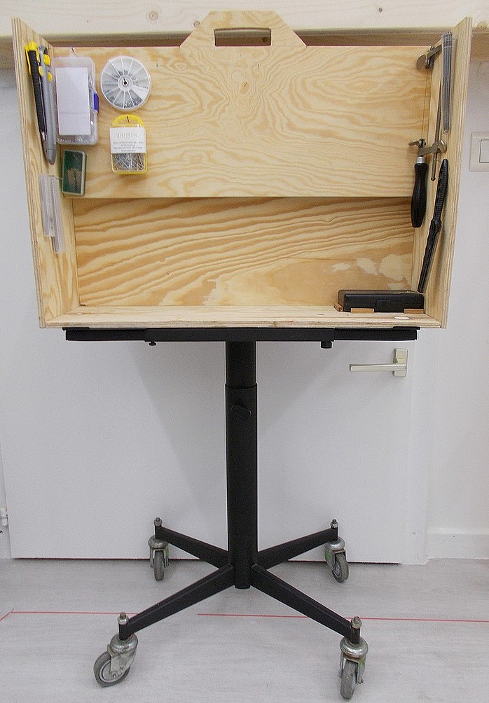 Hier, journée modélisme chez Guy. Il avait conçu il y a fort longtemps un pupitre de rangement pour l'outillage et les accessoires nécessaires au modélisme. Fort de son expérience, nous avons enfin avancé sur le mien. Du matériel sera rajouté peu à peu. Il peut tourner autour de son axe et est déplaçable.