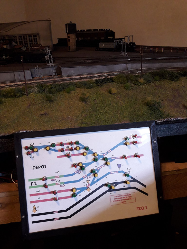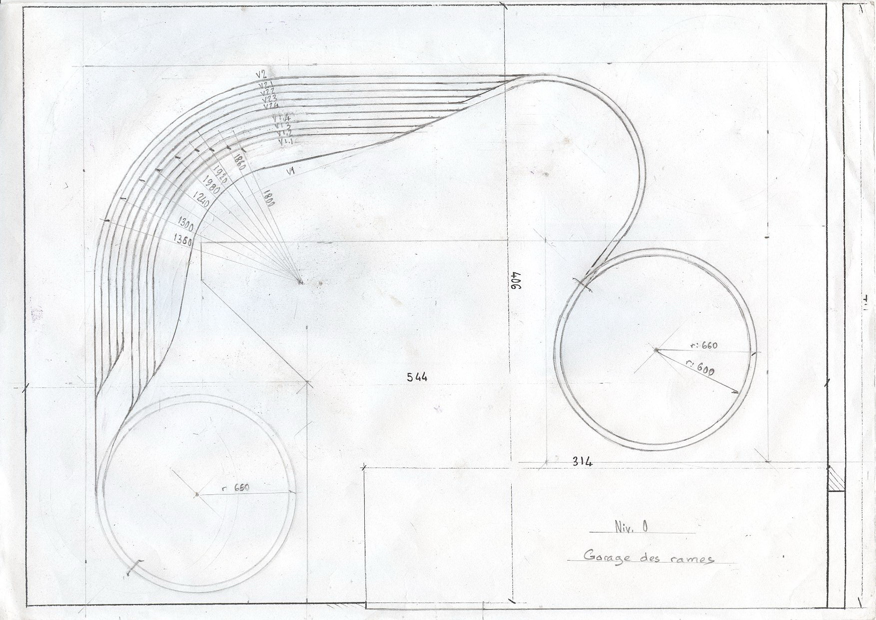Voici le plan de mon réseau. Il est à deux niveaux et an analogique. Par rapport au plan, les ateliers du dépôt et le parc à combustible ont permuté. La voie 1 et la voie 2 sont indépendantes reliées par des bretelles. La configuration est en boucle pour chaque voie. La voie1 et la voie 2 sont alimentées indépendamment l'une de l 'autre de même que la partie gare marchandise et dépôt.