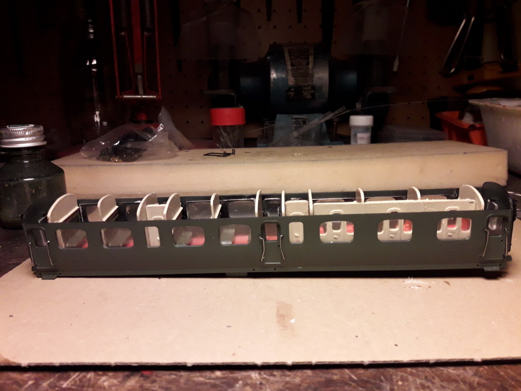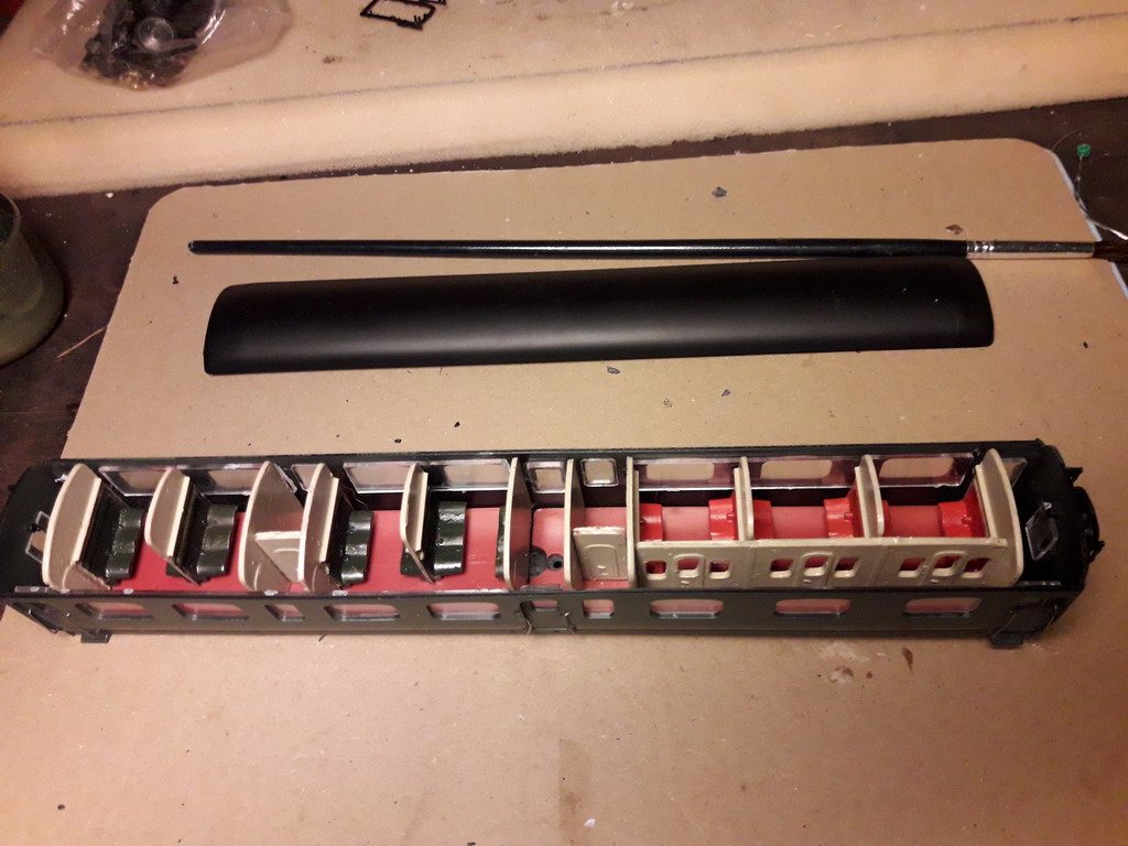 A défaut de B11, comme j'ai deux A3B4 je déclasserai une en B7. Pour ce faire, je vais virer la cloison du couloir coté première classe. Je dois aussi supprimer les accoudoirs des premières classes . On peut imaginer ce déclassement par nécessité tout en prévoyant d'augmenter le nombre de voyageurs pour cette voiture. Je pense qu'une B7 Belge avait la même configuration que les A7 avec un seul WC. Avec 2 WC, les distances entre banquettes de sont pas les mêmes. En fin de compte, RMA est parti d'une caisse de A3B4 pour décliner une A7 (impossible, d'où les cloisons fantaisistes coté 4 baies) et une B7 (impossible) car un seul WC. En principe, le projet de De Caso était de facilité les montées et descentes accélérée des voyageurs d'où la suppression des compartiments et la multiplication des portières, les arrêts étant assez nombreux. Au prix des voitures LMS, cela vaut la peine de bidouiller une rame qui aura de l'allure avec une entorse visible que par des connaisseurs, le train étant fait pour rouler...