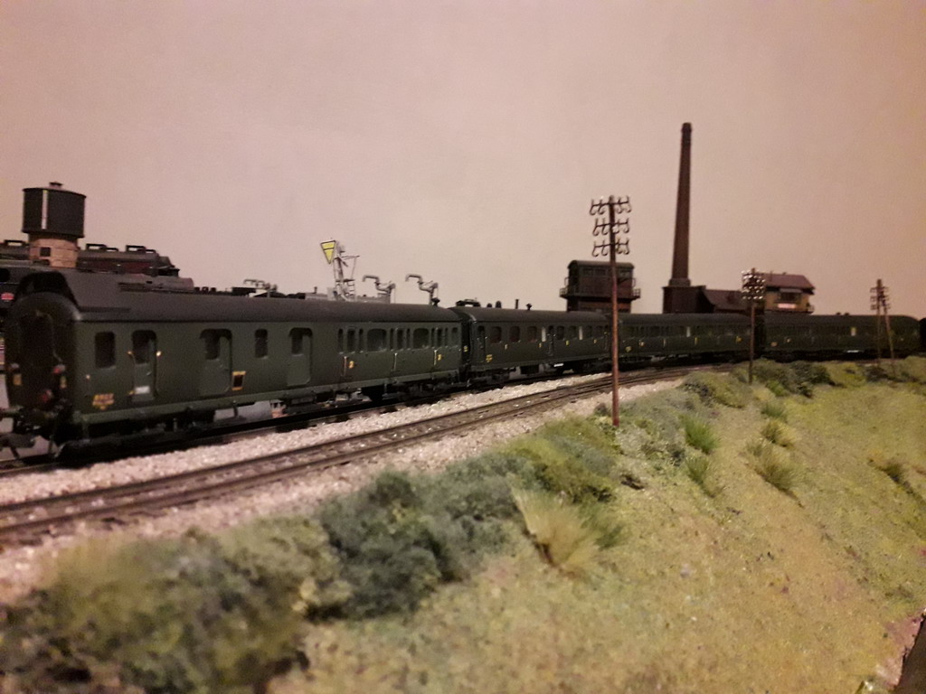 Retour sur la rame Express Nord RMA. J'ai enfin terminé la dernière voiture, une B7 . Sur celle là j'aurai tout connu. Une vrai galère. Le pompon, c'est la goutte de colle sur une face qui m'a obligé à repeindre la caisse. Mes aérographes constamment bouchés m'ont contraint à terminer à la bombe RailColor. Le façonnage des mains montoir était chronophage à souhaits et j'en passe et des meilleures. Bref, la voici en tête du Laon Paris, une composition courte à 5 voitures, pour l'express 276 du milieu de l'après midi.