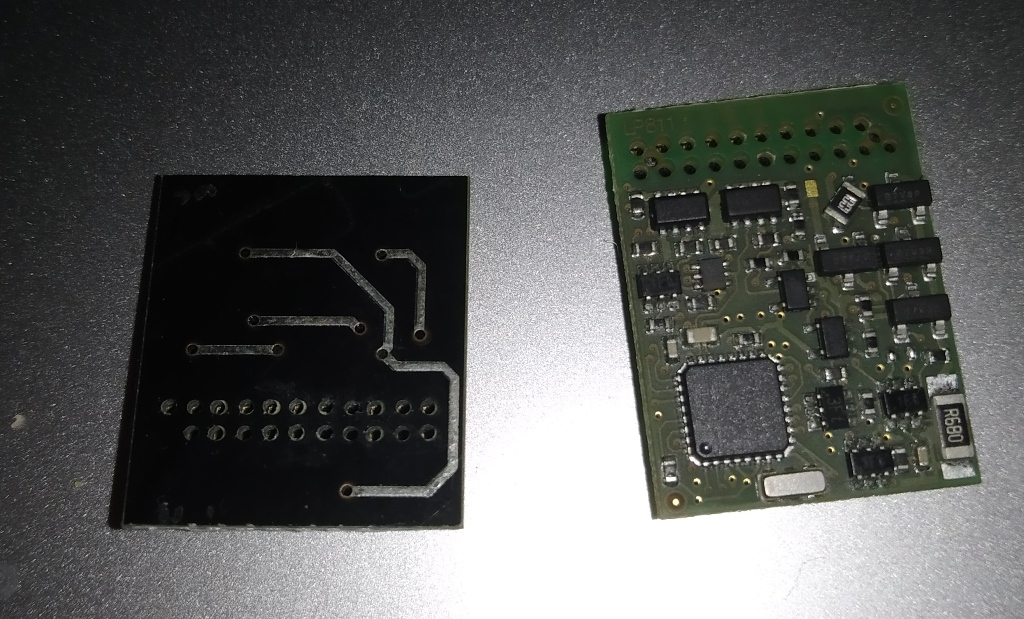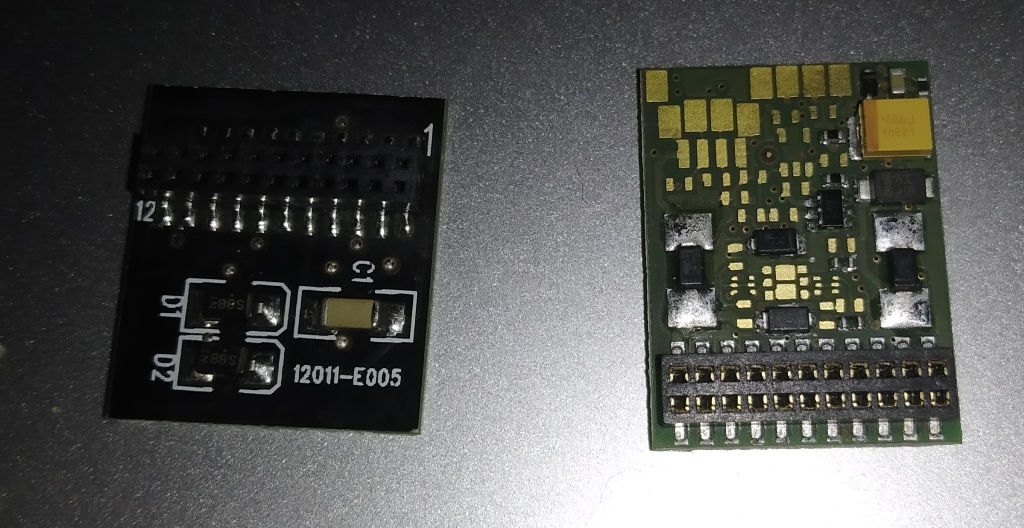 A gauche, ce n'est pas un décodeur mais un "bouchon" qui est mis sur la prise décodeur de la locomotive pour la faire fonctionner en analogique sans décodeur.