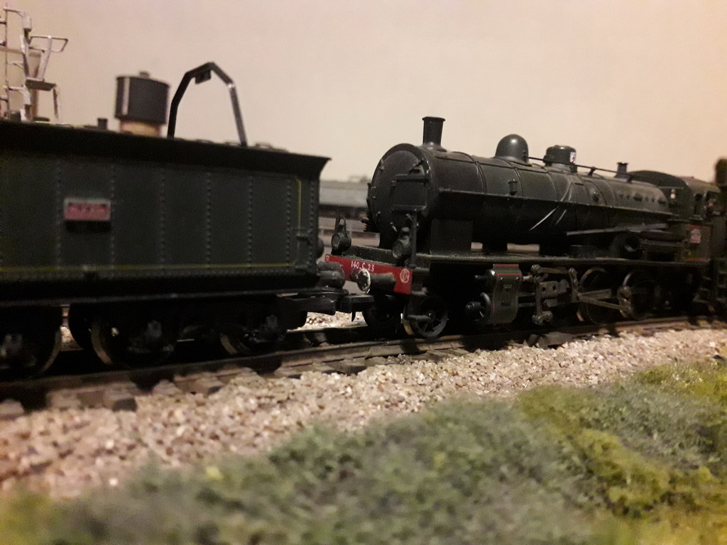 C'est efficace. Cette machine est en attente de remise à niveau dont les améliorations remontent à 1970. Le 34 X est un Maerklin Hamo et les plaques de chez Clarel. La porte de boite à fumée type Ouest Etat est tirée d'un jet de laiton usiné par mon père, elle n'existait pas par Jouef à cette date Les charnières sont celles d'origine découpée à la lame de rasoir, le porte lanterne en laiton fait maison. Les filets jaunes ont été refait en rouge, marquages à la plume sur la traverse avant, tampon OCEM de chez Makette (marque disparue de kit de wagons couvert type PLM). Le projet, reprise de l'embiellage et remplacement des roues et réfections des accessoires et tuyauteries. Plus de 50 ans de service maintenant toujours avec son moteur 3 pôles...