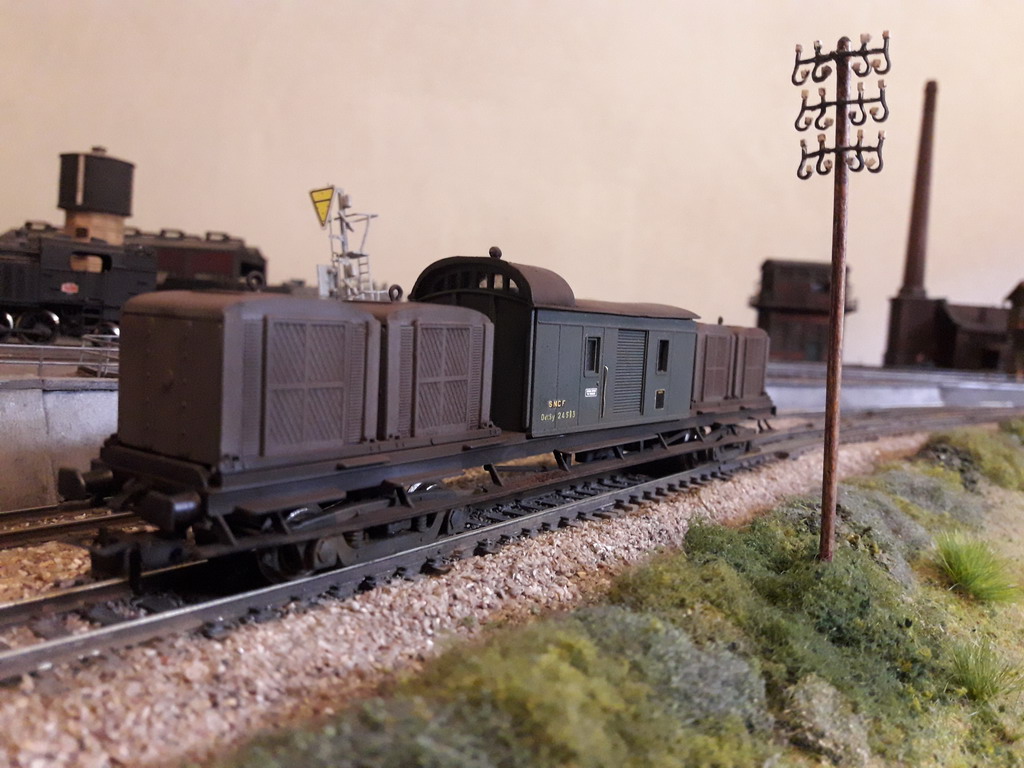 J'ai craqué pour pas trop cher la version Nord du wagon truck de feu RMA pour enfin composer ma rame Flèche d'Or 1956/57. Evidemment ce n'est pas la merveille de AMF87 mais l'allure générale est bonne. J'ai commencé par réduire les longueurs d'attelage, des touches de peinture noir mat sur les plateaux de tampons et patiner les toits. Les anneaux de levage n'étaient pas centrés. Je pense les remplacer mais je n'ai aucune photo exploitable. De même pour les marquages. Des décennies que j'attendais cette acquisition...